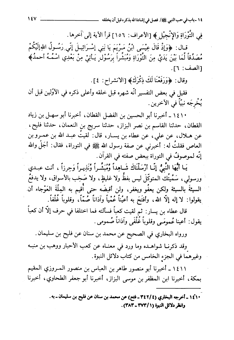 1410 - أخبرنا أبو الحسين بن الفضل القطان أخبرنا أبو سهل بن زياد القطان حدثنا القاسم بن نصر البزاز حدثنا سريج بن النعمان حدثنا فليح عن هلال عن علي عن عطاء بن يسار قال : لقيت عبد الله بن عمرو بن العاص فقلت له : أخبرني عن صفة رسول الله صلى الله عليه و سلم في التوراة فقال : أجل و الله إنه لموصوف في التوارة ببعض صفته في القرآن