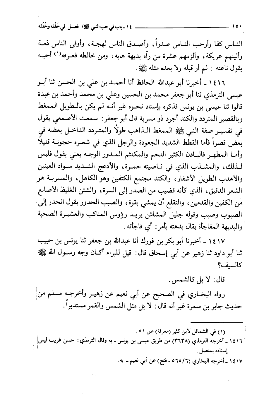 1417 - أخبرنا أبو بكر بن فورك أنا عبد الله بن جعفر ثنا يونس بن حبيب ثنا أبو داود ثنا زهير عن أبي إسحاق قال : قيل للبراء أكان وجه رسول الله صلى الله عليه و سلم كالسيف ؟