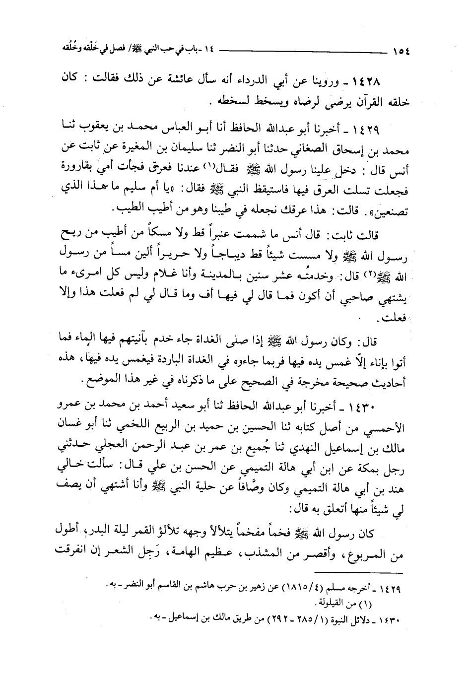 1428 - و روينا عن أبي الدرداء أنا سأل عائشة عن ذلك فقالت : كان خلقه القرآن يرضي لرضاه و يسخط لسخطه