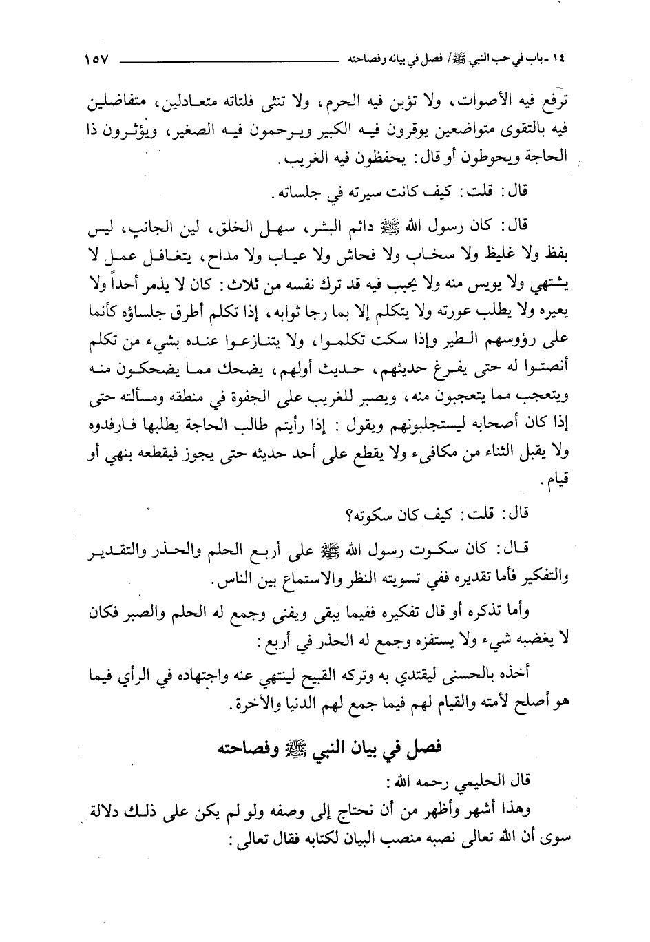 فصل في بيان النبي صلى الله عليه و سلم فصاحته ـ قال الحليمي رحمه الله : و هذا أشهر و أظهر من أن نحتاج إلى وصفه و لو لم يكن على ذلك دلالة سوى أن الله تعالى نصبه منصب البيان لكتابه فقال تعالى : { و أنزلنا إليك الذكر لتبين للناس ما نزل إليهم } ـ لكان كافيا فإنه لو لم يكن أتاه البيان لكتابه و لم يرق فيه إلى أعلى الدرجات لما رضيه ليبين كتابه و كشف عن معاني خطابه و قد جاء عنه صلى الله عليه و سلم أنه سئل عن سحائب مرت و ذكر الحديث الذي :