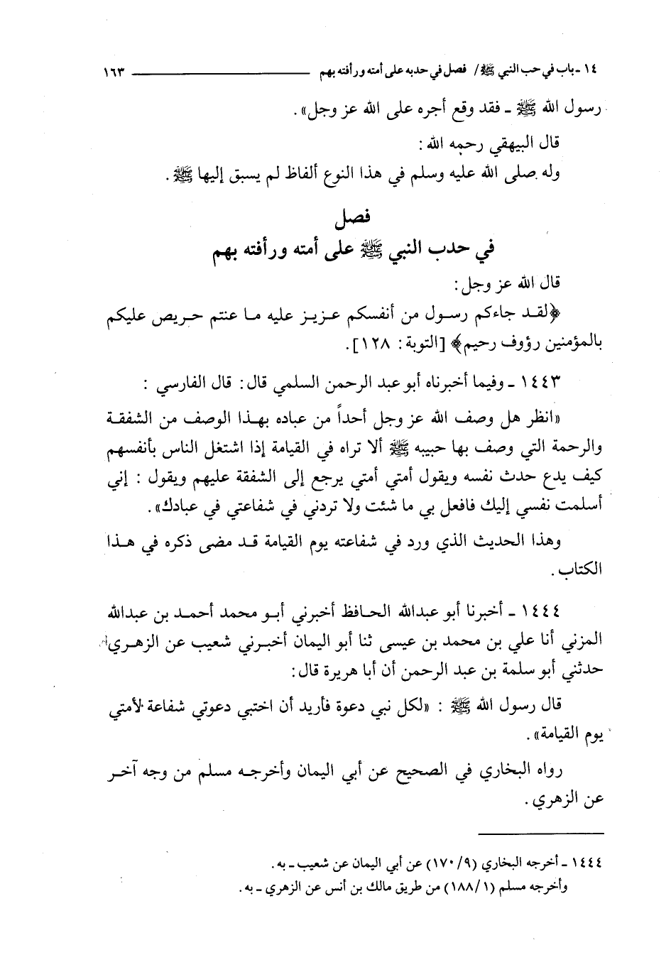 1443 - و فيما أخبرناه أبو عبد الرحمن السلمي قال : قال الفارسي : انظر هل وصف الله عز و جل أحدا من عباده بهذا الوصف من الشفقة و الرحمة التي وصف بها حبيبه صلى الله عليه و سلم ألا تراه في القيامة إذا اشتغل الناس بأنفسهم كيف يدع حدث نفسه و يقول أمتي أمتي يرجع إلى الشفقة عليهم و يقول : إني أسلمت نفسي إليك فافعل بي ما شئت و لا تردني في شفاعتي في عبادك