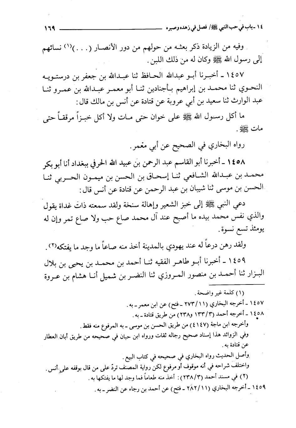 1458 - أخبرنا أبو القاسم عبد الرحمن بن عيبد الله الحرفي ببغداد أنا أبو بكر محمد بن عبد الله الشافعي ثنا إسحاق بن الحسن بن ميمون الحربي ثنا الحسن بن موسى ثنا شيبان بن عبد الرحمن عن قتادة عن أنس قال : دعي النبي صلى الله عليه و سلم إلى خبز الشعير و إهالة سنخة و لقد سمعته ذات غداة يقول و الذي نفس محمد بيده ما أصبح عند آل محمد صاع حب و لا صاع تمر و إن له يومئذ تسع نسوة