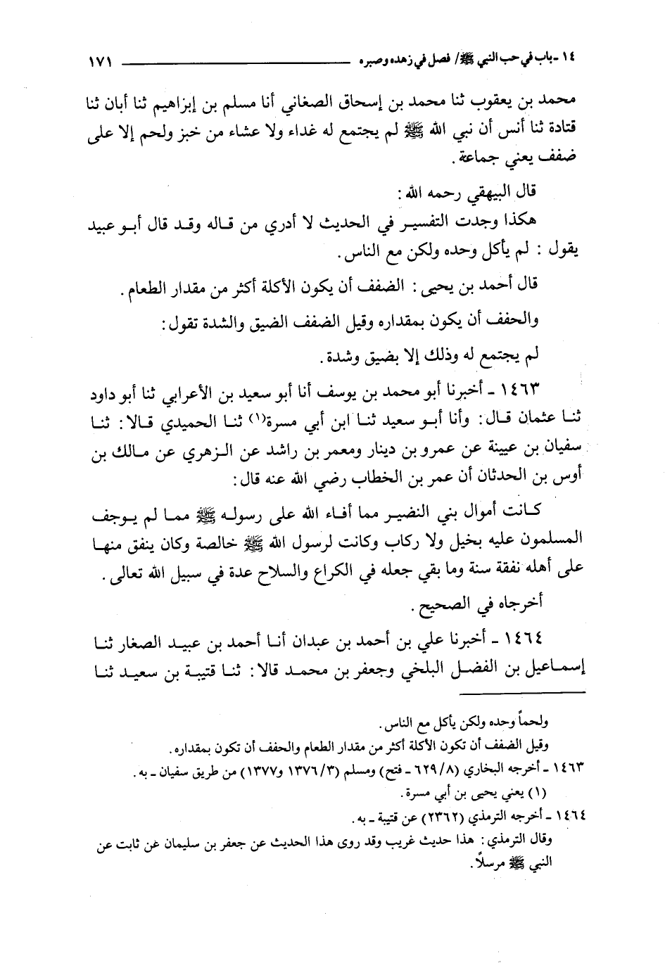 1463 - أخبرنا أبو محمد بن يوسف أنا أبو سعيد بن الأعرابي ثنا أبو داود ثنا عثمان قال : و أنا أبو سعيد ثنا ابن أبي مسرة ثنا الحميدي قالا : ثنا سفيان بن عيينة عن عمرو بن دينار و معمر بن راشد عن الزهري عن مالك بن أوس بن الحدثان أن عمر بن الخطاب رضي الله عنه قال : كانت أموال بني النضير مما أفاء الله على رسوله صلى الله عليه و سلم مما لم يوجف المسلمون عليه بخيل و لا ركاب و كانت لرسول الله صلى الله عليه و سلم خالصة و كان ينفق منها على أهله نفقة سنة و ما بقي جعله في الكراع و السلاح عدة في سبيل الله تعالى