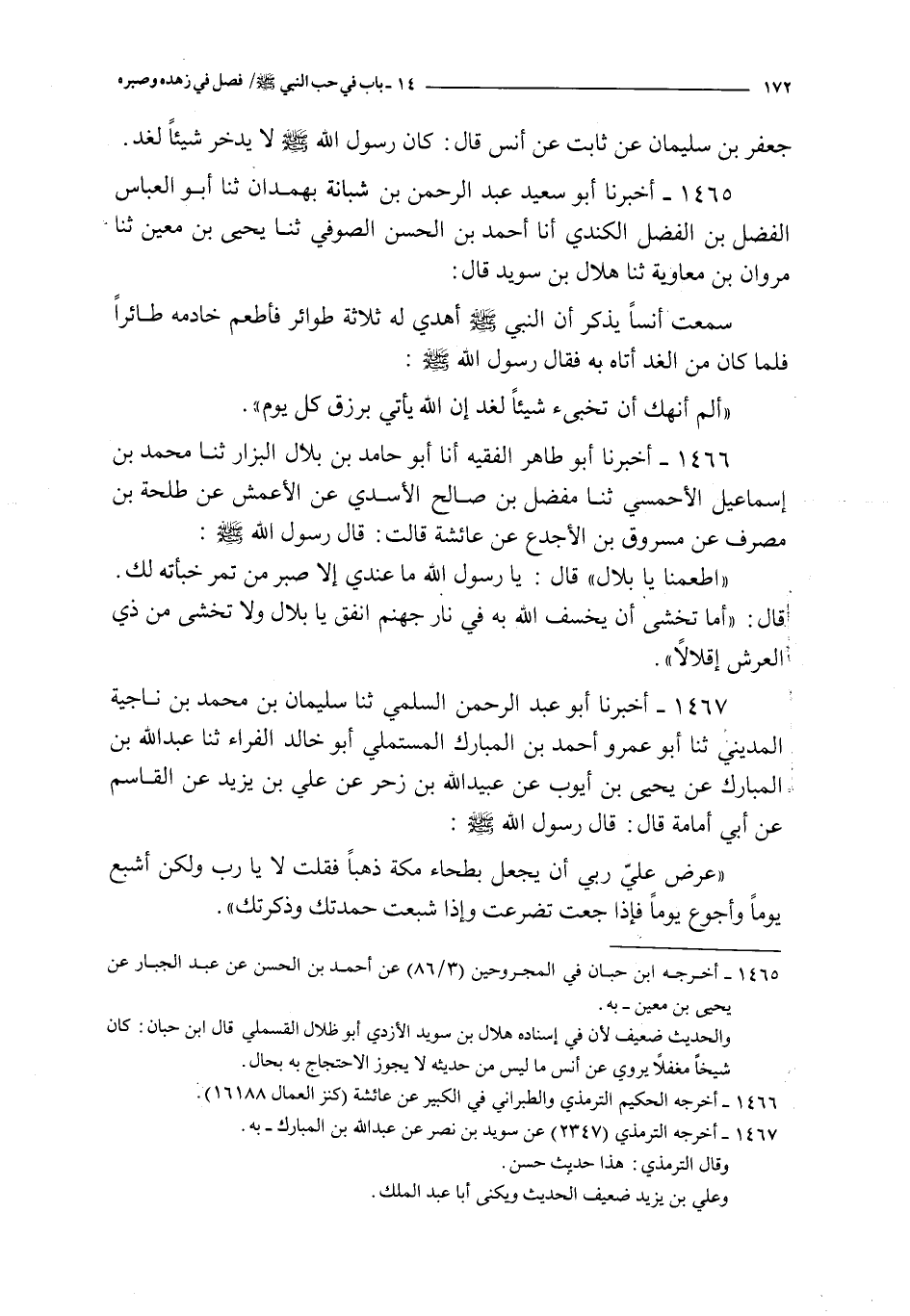 1465 - أخبرنا أبو سعيد عبد الرحمن بن شبانة بهمدان ثنا أبو العباس الفضل بن الفضل الكندي أنا أحمد بن الحسن الصوفي ثنا يحيى بن معين ثنا مروان بن معاوية ثنا هلال بن سويد قال : سمعت أنسا يذكر أن النبي صلى الله عليه و سلم أهدي له ثلاثة طوائر فأطعم خادمه طائرا فلما كان من الغد أتاه به فقال رسول الله صلى الله عليه و سلم :