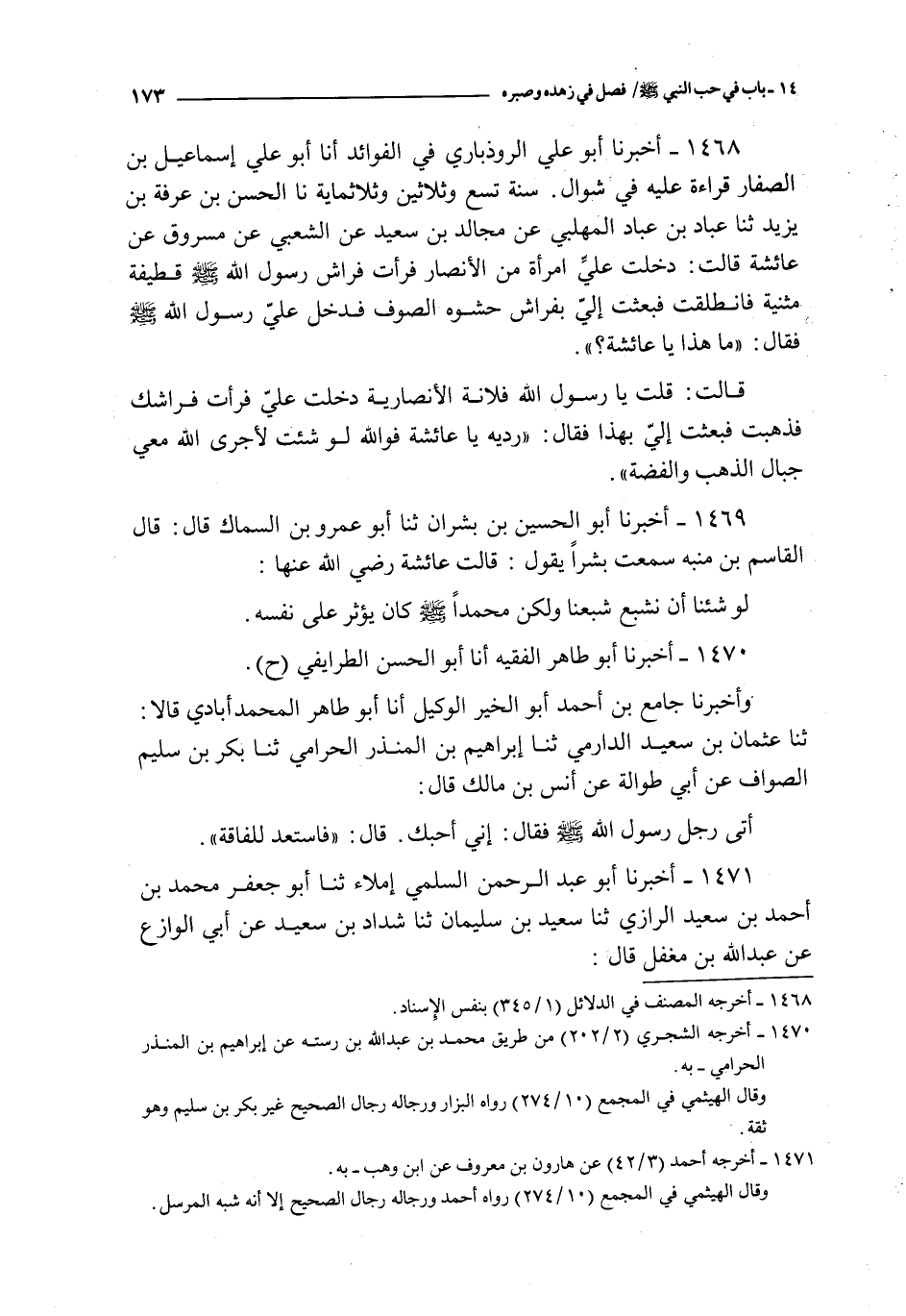 1468 - أخبرنا أبو علي الروذباري في الفوائد أنا أبو علي إسماعيل بن الصفار قراءة عليه في شوال سنة تسع و ثلاثين و ثلاثماية نا الحسن بن عرفة بن يزيد ثنا عباد بن عباد المهلبي عن مجالد بن سعيد عن الشعبي عن مسروق عن عائشة قالت : دخلت علي امرأة من الأنصار فرأت فراش رسول الله صلى الله عليه و سلم قطيفة مثنية فانطلقت فبعثت إلي بفراش حشوه الصوف فدخل علي رسول الله صلى الله عليه و سلم فقال : ما هذا يا عائشة