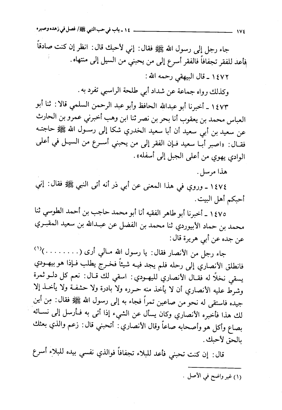 1475 - أخبرنا أبو طاهر الفقيه أنا أبو محمد حاجب بن أحمد الطوسي ثنا محمد بن حماد الأبيوردي ثنا محمد بن الفضل عن عبد الله بن سعيد المقبري عن جده عن أبي هريرة قال : جاء رجل من الأنصار فقال : يا رسول الله ما لي أرى ( ) فانطلق الأنصاري إلى رحله فلم يجد فيه شيئا فخرج يطلب فإذا هو بيهودي يسقي نخلا له فقال الأنصاري لليهودي : اسقي لك قال : نعم كل دلو ثمرة و شرط عليه الأنصاري أن لا يأخذ منه حرره و لا بادرة و لا حشفة و لا يأخذ إلا جيده فاستقى له نحو من صاعين تمرا فجاء به إلى رسول الله صلى الله عليه و سلم فقال : من أين لك هذا فأخبره الأنصاري و كان يسأل عن الشيء إذا أتى به فأرسل إلى نسائه بصاع و أكل هو و أصحابه صاعا و قال الأنصاري : أتحبني قال : زعم و الذي بعثك بالحق لأحبك