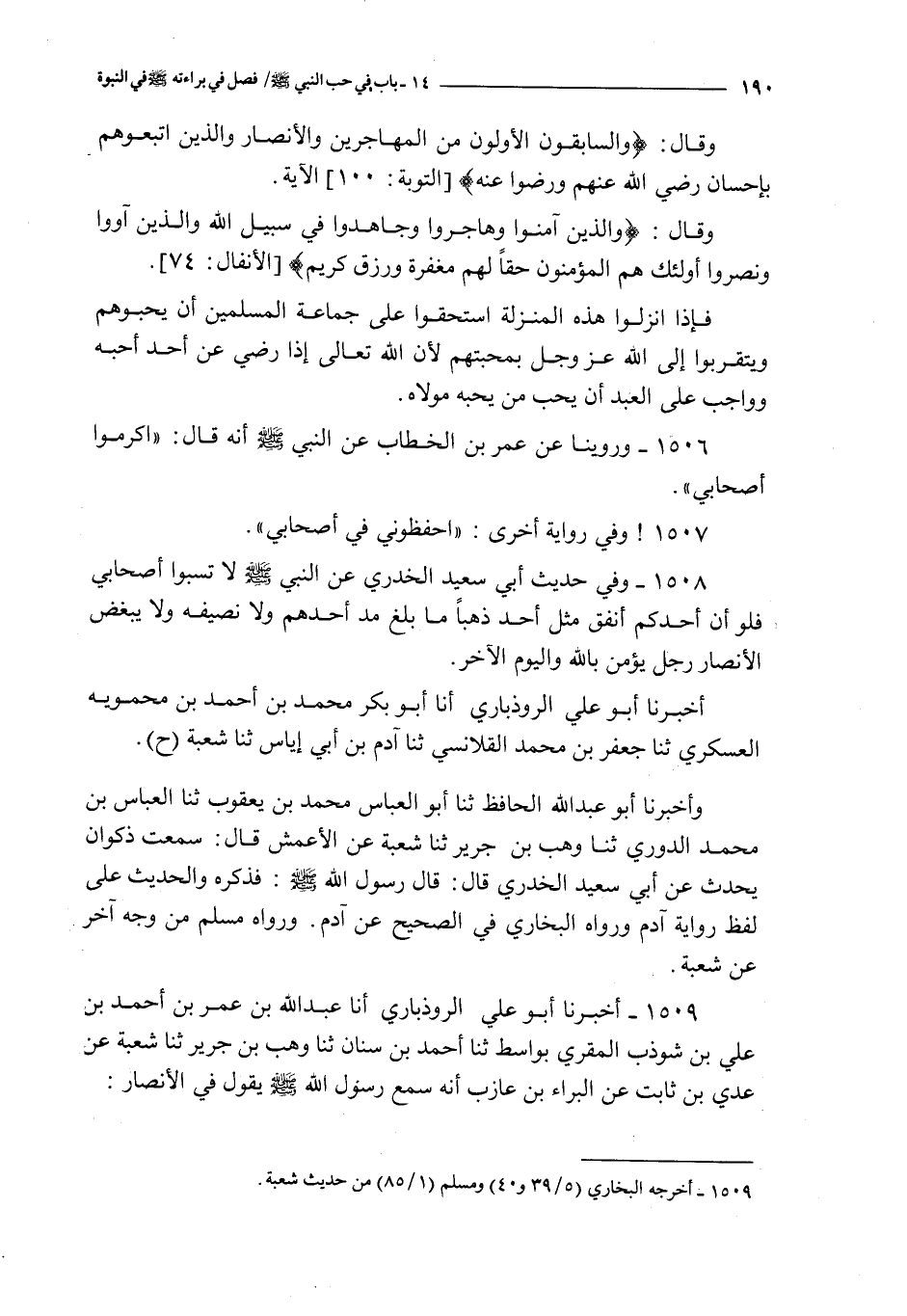 1509 - أخبرنا أبو علي الروذباري أنا عبد الله بن عمر بن أحمد بن علي بن شوذب المقري بواسط ثنا أحمد بن سنان ثنا وهب بن جرير ثنا شعبة عن عدي بن ثابت عن البراء بن عازب : أنه سمع رسول الله صلى الله عليه و سلم يقول في الأنصار : لا يحبهم إلا مؤمن و لا يبغضهم إلا منافق من أحبهم أحب الله و من أبغضهم أبغضه الله