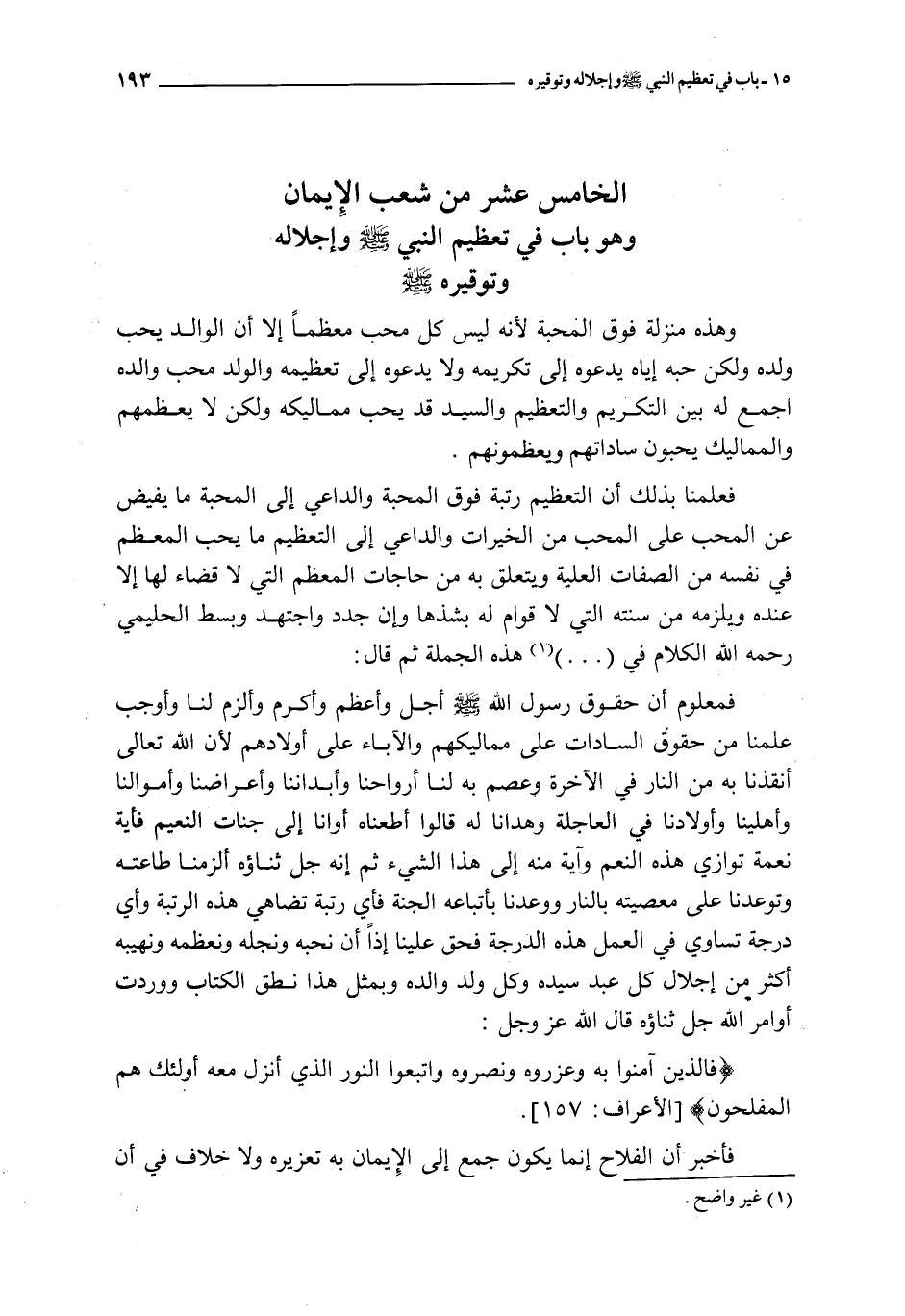 الخامس عشر من شعب الإيمان و هو باب في تعظيم النبي صلى الله عليه و سلمو إجلاله و توقيره صلى الله عليه و سلم و هذه منزلة فوق المحبة لأنه ليس كل محب معظما إلا أن الوالد يجب ولده و لكن حبه إياه يدعوه إلى تكريمه و لا يدعوه إلى تعظيمة و الولد محب والده اجمع له بين التكريم و التعظيم و السيد قد يحب ممالكيه و لكن لا يعظمهم و المماليك يحبون ساداتهم و يعظمونهم فعلمنا بذلك أن التعظيم رتبة فوق المحبة و الداعي إلى المحبة ما يفيض عن المحب على المحب من الخيرات و الداعي إلى التعظيم ما يحب المعظم في نفسه من الصفات العلية و يتعلق به من حاجات المعظم التي لا قضاء لها إلا عنده و يلزمه من سنته التي لا قوام له بشذها و إن جدد و اجتهد و بسط الحليمي رحمه الله الكلام في ( ) هذه الجملة ثم قال : فمعلوم أن حقوق رسول الله صلى الله عليه و سلم أجل و أعظم و أكرم و ألزم لنا و أوجب علمنا من حقوق السادات على مماليكهم و الآباء على أولادهم لأن الله تعالى أنقذنا به من النار في الآخرة و عصم به لنا أرواحنا و أبداننا و أعراضنا و أموالنا و أهلينا و أولادنا في العاجلة و هدانا له قالوا أطعناه أوانا إلى جنات النعيم فأية نعمة توازي هذه النعم و آية منه إلى هذا الشيء ثم إنه جل ثناؤه ألزمنا طاعته و توعدنا على معصيته بالنار و وعدنا بأتباعه الجنة فأي رتبة تضاهي هذه الرتبة و أي درجة تساوي في العمل هذه الدرجة فحق عليتا إذا أن نحبه و نجله و نعظمه و نهيبه أكثر من إجلال كل عبد سيده و كل ولد والده و بمثل هذا نطق الكتاب و وردت أوامر الله جل ثناؤه قال الله عز و جل { فالذين آمنوا به وعزروه ونصروه واتبعوا النور الذي أنزل معه أولئك هم المفلحون } فأخبر أن الفلاح إنما يكون جمع إلى الإيمان به تعزيره و لا خلاف في أن التعزير ههنا التعظيم و قال : { إنا أرسلناك شاهدا ومبشرا ونذيرا * لتؤمنوا بالله ورسوله وتعزروه وتوقروه } فأبان أن حق رسول الله صلى الله عليه و سلم في أمته أن يكون معززا موقرا مهيبا و لا يعامل بالاسترسال و المباسطة كما يعامل الأكفاء بعضهم بعضا قال الله عز و جل : { لا تجعلوا دعاء الرسول بينكم كدعاء بعضكم بعضا } فقيل في معناه لا تجعلوا دعائه إياكم كدعاء بعضكم بعضا فتؤخروا إجابته بالأعذار و العلل التي يؤخر بها بعضكم إجابة بعض و لكن عظموه بسرعة الإجابة و معاجلة الطاعة و لم يجعل الصلاة لهم عذرا في التخلف عن الإجابة إذا دعا أحدهم و هو يصلي إعلاما لهم بأن الصلاة إذا لم تكن عذرا يستباح به تأخير الإجابة فما دونها من معاني أعذارا بعد ذلك و ذكر حديث أبي بن كعب رضي الله عنه كما