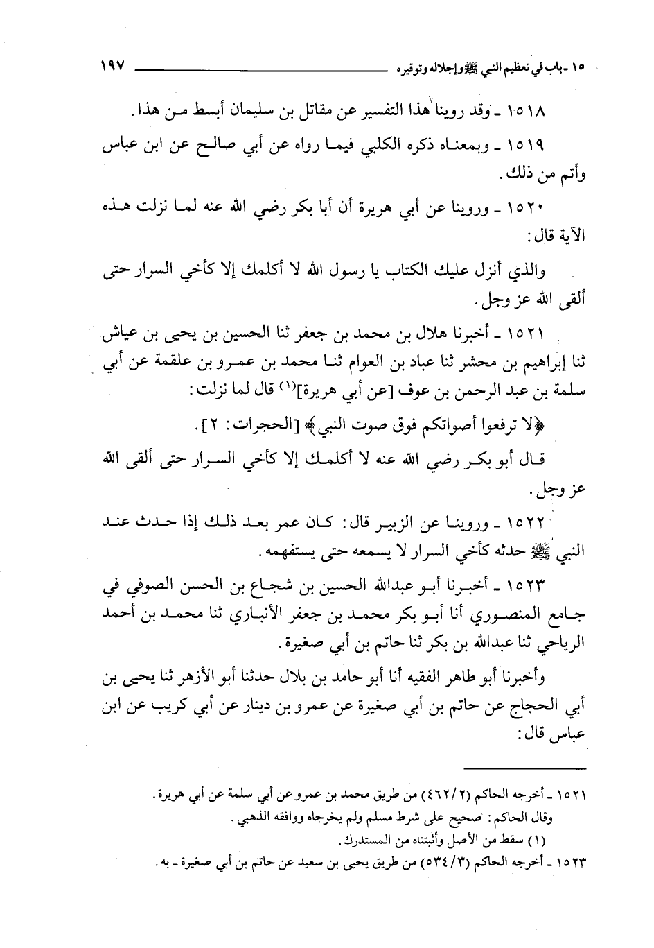 1520 - و روينا عن أبي هريرة أن أبا بكر رضي الله عنه لما نزلت هذه الآية قال : و الذي أنزل عليك يا رسول الله لا أكلمك إلا كأخي السرار حتى ألقى الله عز و جل