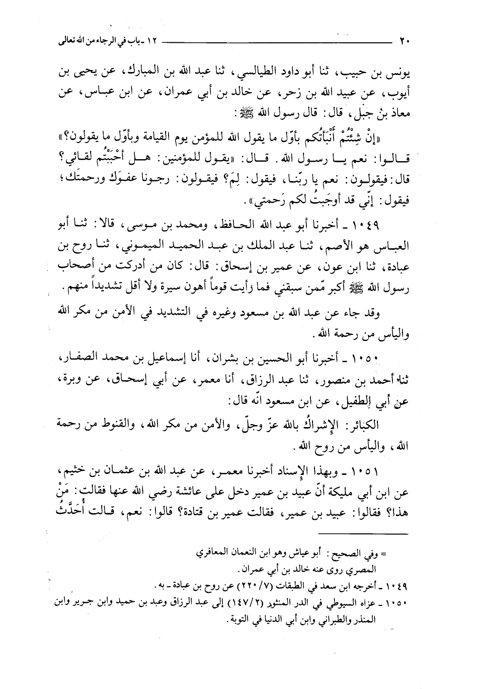1050 - أخبرنا أبو الحسين بن بشران أنا إسماعيل بن محمد الصفار ثنا أحمد بن منصور ثنا عبد الرزاق أنا معمر عن أبي إسحاق عن وبرة عن أبي الطفيل عن ابن مسعود أنه قال : الكبائر : الإشراك بالله عز و جل و الأمن من مكر الله و القنوط من رحمة الله و اليأس من روح الله