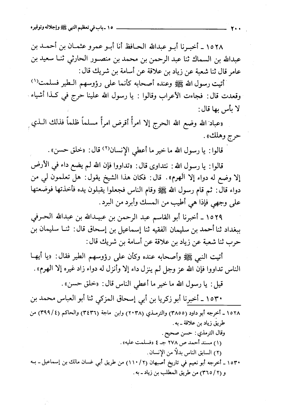 1528 - أخبرنا أبو عبد الله الحافظ أنا أبو عمرو عثمان بن أحمد بن عبد الله بن السماك ثنا عبد الرحمن بن محمد بن منصور الحارثي ثنا سعيد بن عامر قال ثنا شعبة عن زياد بن علاقة عن أسامة بن شريك قال : أتيت رسول الله صلى الله عليه و سلم و عنده أصحابه كأنما على رؤوسهم الطير فسلمت و قعدت قال : فجاءت الأعراب و قالوا : يا رسول الله علينا حرج في كذا أشياء لا بأس بها قال :
