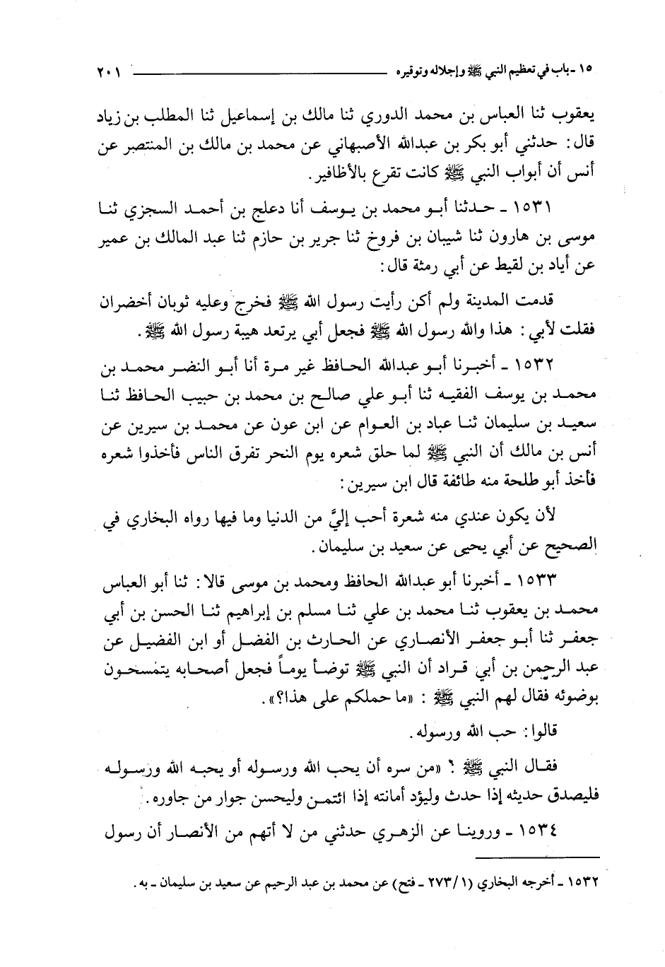 1532 - أخبرنا أبو عبد الله الحافظ غير مرة أنا أبو النضر محمد بن محمد بن يوسف الفقيه ثنا أبو علي صالح بن محمد بن حبيب الحافظ ثنا سعيد بن سليمان ثنا عبد بن العوام عن ابن عون عن محمد بن سيرين عن أنس بن مالك : أن النبي صلى الله عليه و سلم لما حلق شعره يوم النحر تفرق الناس فأخذوا شعره فأخذ أبو طلحة منه طائفة قال ابن سيرين :