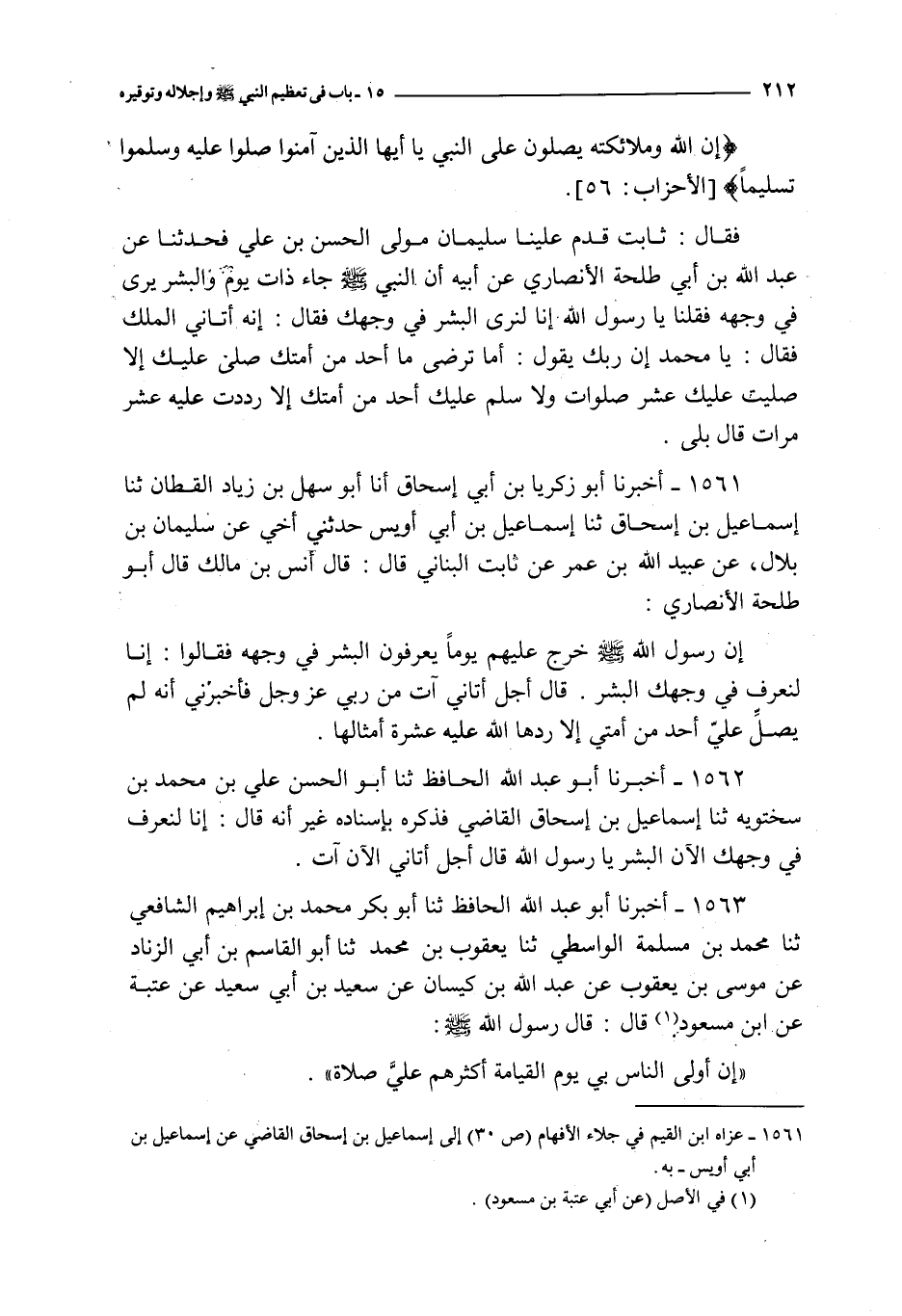 1561 - أخبرنا أبو زكريا بن أبي إسحاق أنا أبو سهل بن زياد القطان ثنا إسماعيل بن إسحاق ثنا إسماعيل بن أبي أويس حدثني أخي عن سليمان بن بلال عن عبيد الله بن عمر عن ثابت البناني قال : قال أنس بن مالك قال أبو طلحة الأنصاري : إن رسول الله صلى الله عليه و سلم خرج عليهم يوما يعرفون البشر في وجهه فقالوا : إنا لنعرف في وجهك البشر قال أجل أتاني آت من ربي عز و جل فأخبرني أنه لم يصل علي أحد من أمتي إلا ردها الله عليه عشرة أمثالها