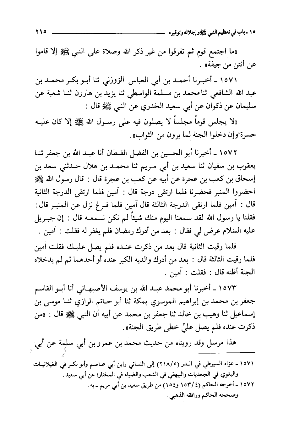 1573 - أخبرنا أبو محمد عبد الله بن يوسف الأصبهاني أنا أبو القاسم جعفر بن محمد بن إبراهيم الموسوي بمكة ثنا أبو حاتم الرازي ثنا موسى بن إسماعيل ثنا وهيب بن خالد ثنا جعفر بن محمد عن أبيه : أن النبي صلى الله عليه و سلم قال : من ذكرت عنده فلم يصل علي خطى طريق الجنة