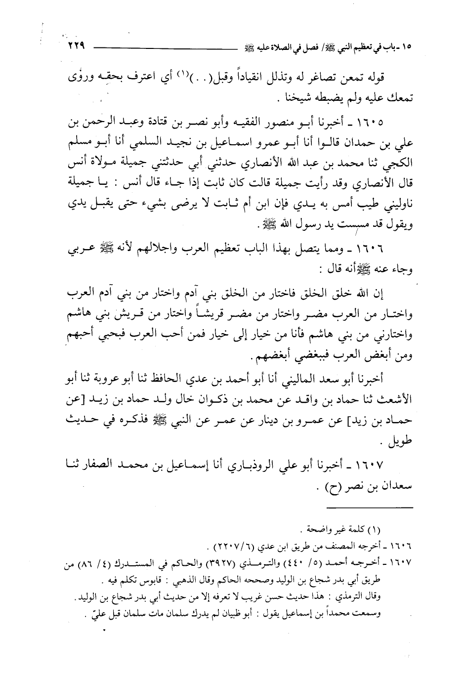 1606 - ـ : و مما يتصل بهذا الباب تعظيم العرب و اجلالهم لأنه صلى الله عليه و سلم عربي و جاء عنه صلى الله عليه و سلم أنه قال :