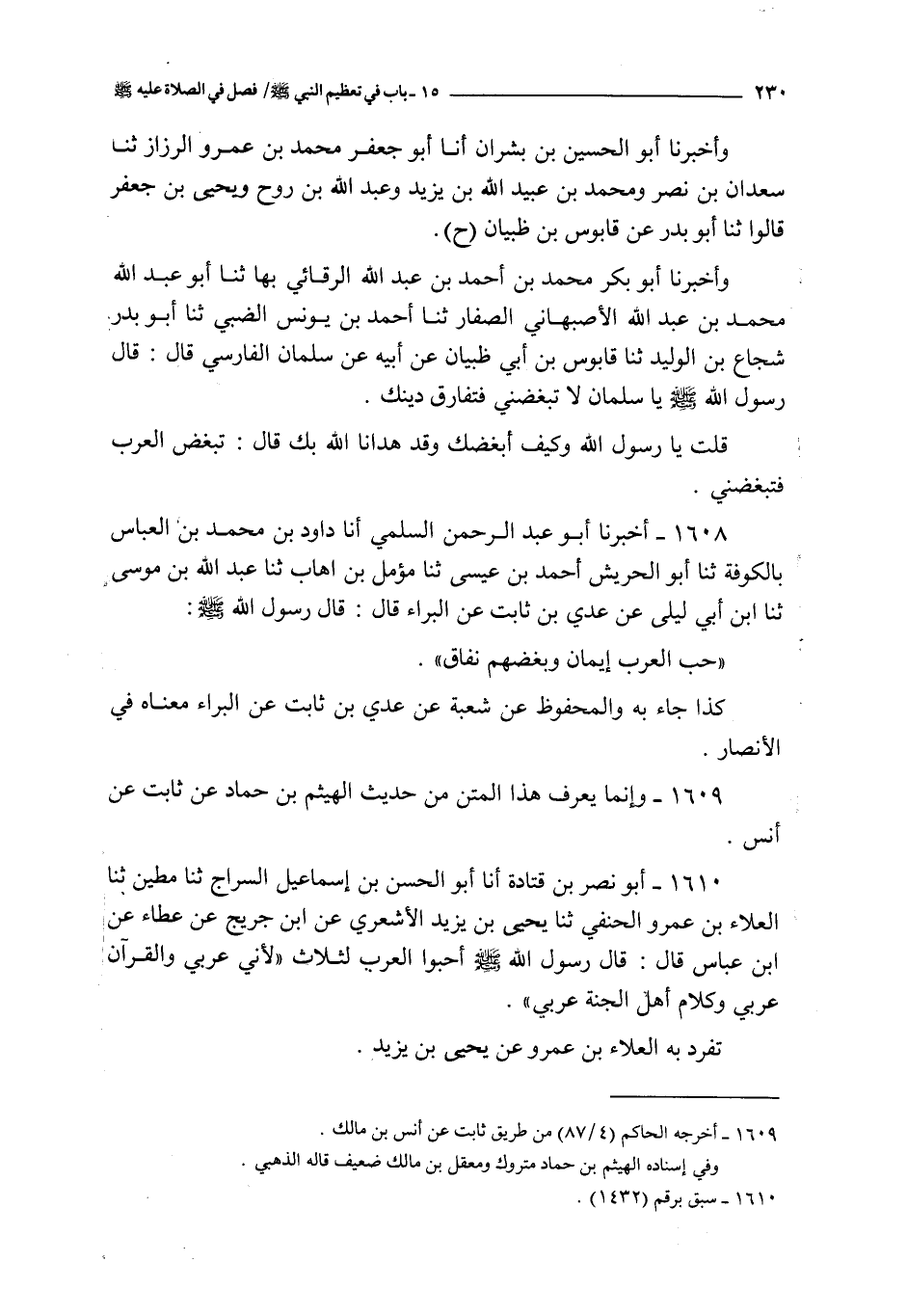 1610 - ـ أبو نصر بن قتادة أنا أبو الحسن بن إسماعيل السراج ثنا مطين ثنا العلاء بن عمرو الحنفي ثنا يحيى بن يزيد الأشعري عن ابن جريج عن عطاء عن ابن عباس قال : قال رسول الله صلى الله عليه و سلم أحبوا العرب لثلاث لأني عربي و القرآن عربي و كلام أهل الجنة عربي