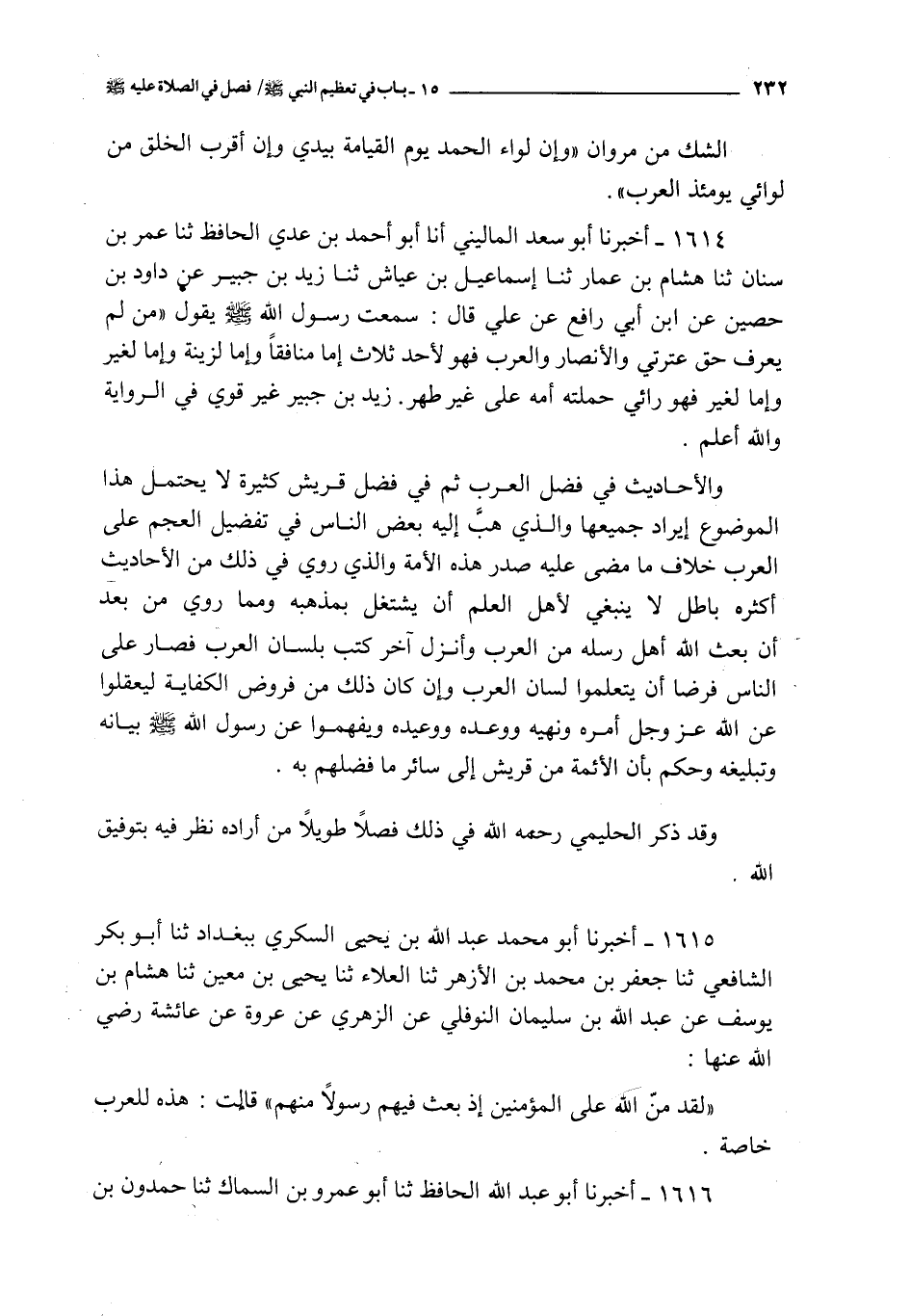 و الأحاديث في فضل العرب ثم فضل قريش كثيرة لا يحتمل هذا الموضوع إيراد جميعها و الذي هب إليه بعض الناس في تفضيل العجم على العرب خلاف ما مضى عليه صدر هذه الأمة و الذي روي في ذلك من الأحاديث أكثره باطل لا ينبغي لأهل العلم أن يشتغل بمذهبه و مما روي من بعد أن بعث الله أهل رسله من العرب و أنزل آخر كتب بلسان العرب فصار على الناس فرضا أن يتعلموا لسان العرب و إن كان ذلك من فروض الكفاية ليعقلوا عن الله عز و جل أمره و نهيه و وعده و وعيده و يفهموا عن رسول الله صلى الله عليه و سلم بيانه و تبليغه و حكم بأن الأئمة من قريش إلى سائر ما فضلهم به
