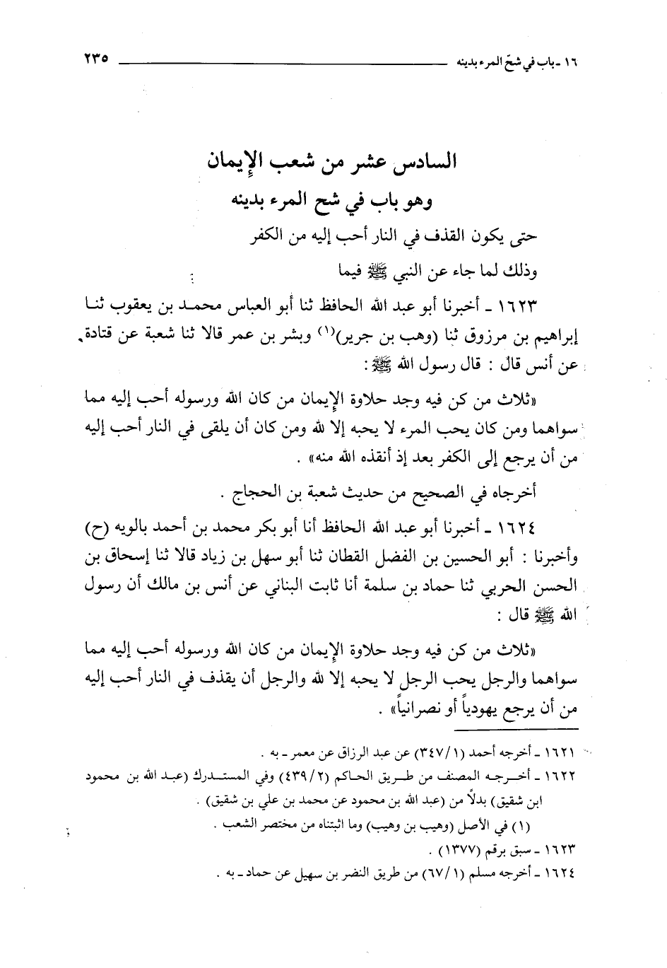 السادس عشر من شعب الإيمان و هو باب في شح المرء بدينه ـ حتى يكون القذف في النار أحب إليه من الكفر ـ و ذلك لما جاء عن النبي صلى الله عليه و سلم فيما