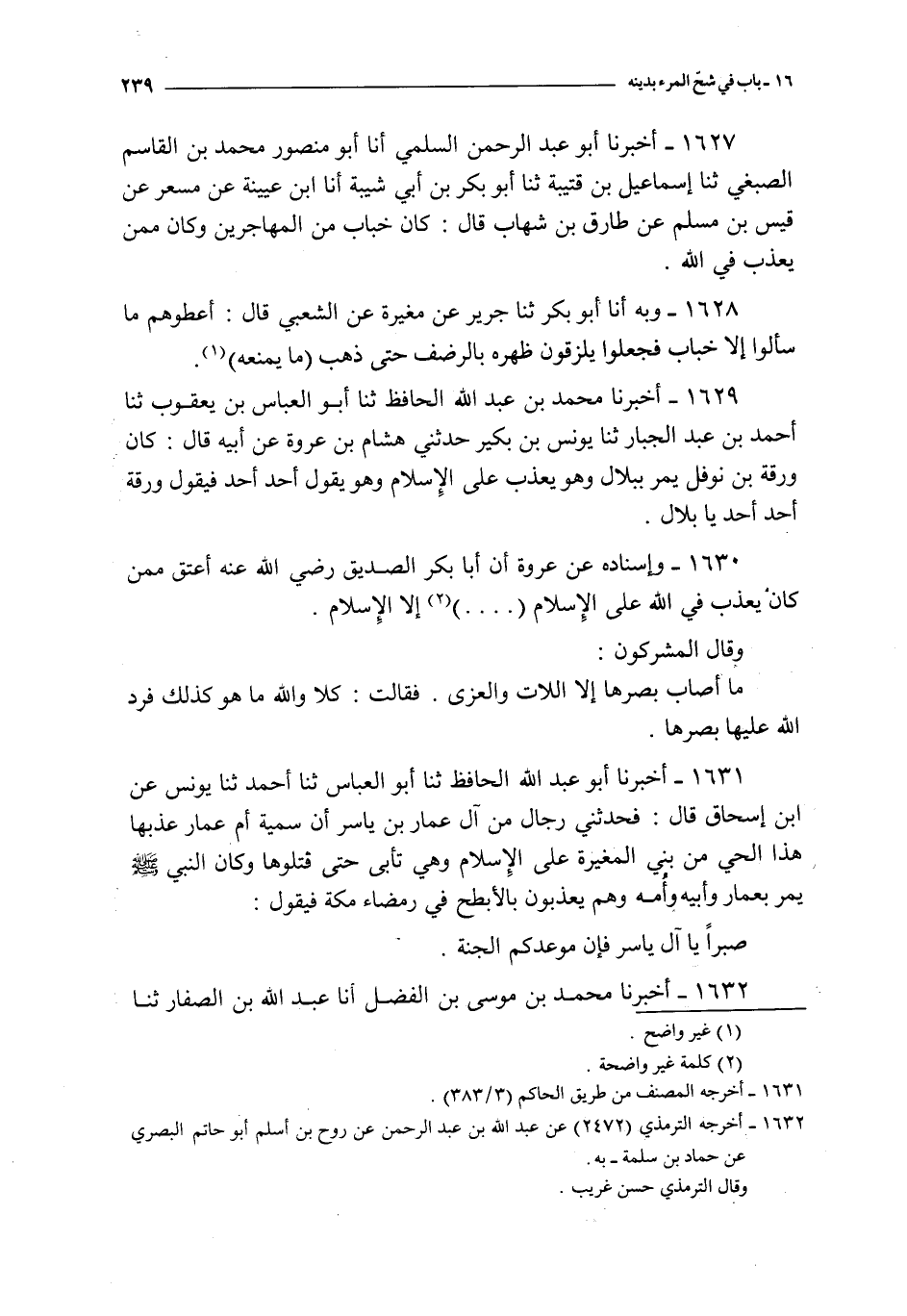 1630 - و إسناده عن عروة : أن أبا بكر الصديق رضي الله عنه أعتق ممن كان يعذب في الله على الإسلام ( ) إلا الإسلام