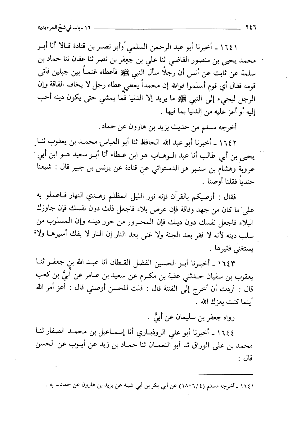 1641 - أخبرنا أبو عبد الرحمن السلمي و أبو نصر بن قتادة قالا أنا أبو محمد يحيى بن منصور القاضي ثنا علي بن جعفر بن نصر ثنا عفان ثنا حماد بن سلمة عن ثابت عن أنس : أن رجلا سأل النبي صلى الله عليه و سلم فأعطاه غنما بين جبلين فأتى قومه فقال أي قوم أسلموا فو الله إن محمدا يعطي عطاء رجل لا يخاف الفاقة و إن الرجل ليجيء إلى النبي صلى الله عليه و سلم ما يريد إلا الدنيا فما يمشي حتى يكون دينه أحب إليه أو أعز عليه من الدنيا بما فيها