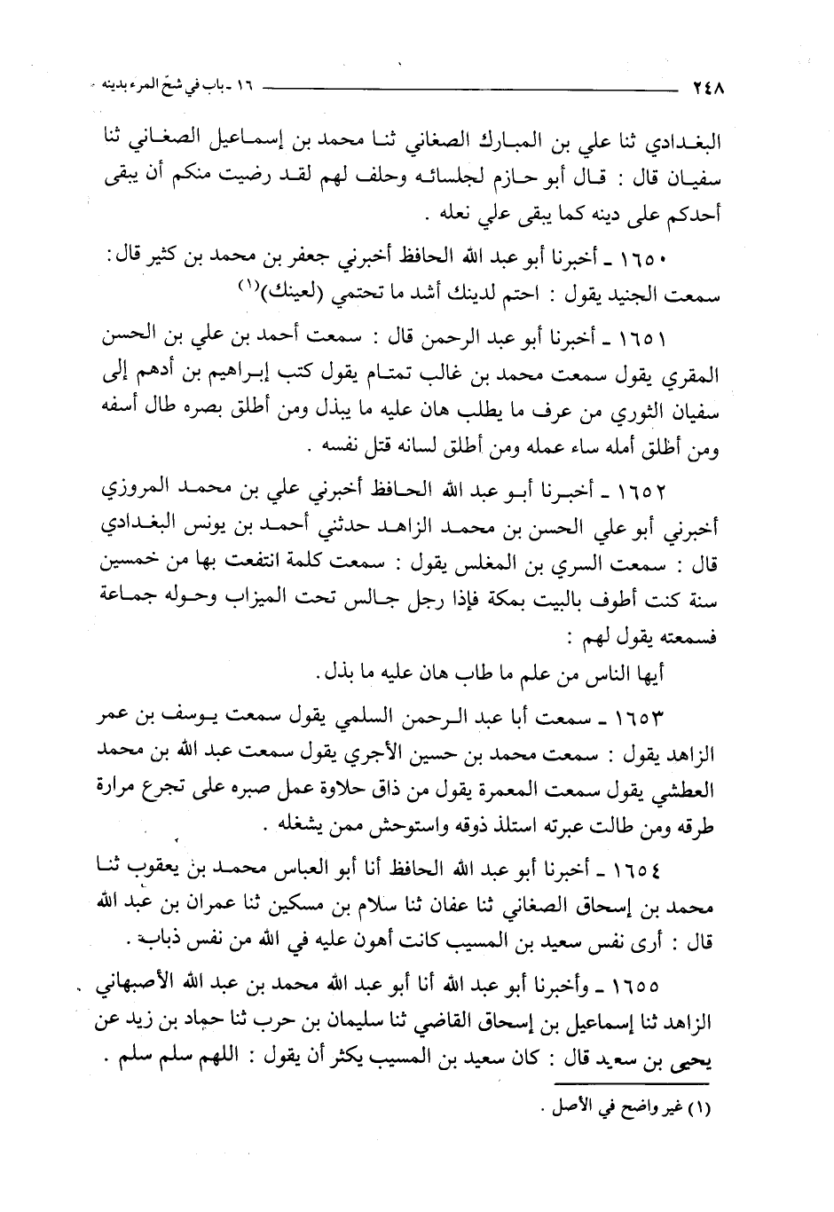 1650 - أخبرنا أبو عبد الله الحافظ أخبرني جعفر بن محمد بن كثير قال : سمعت الجنيد يقول : احتم لدينك أشد ما تحتمي لعينك