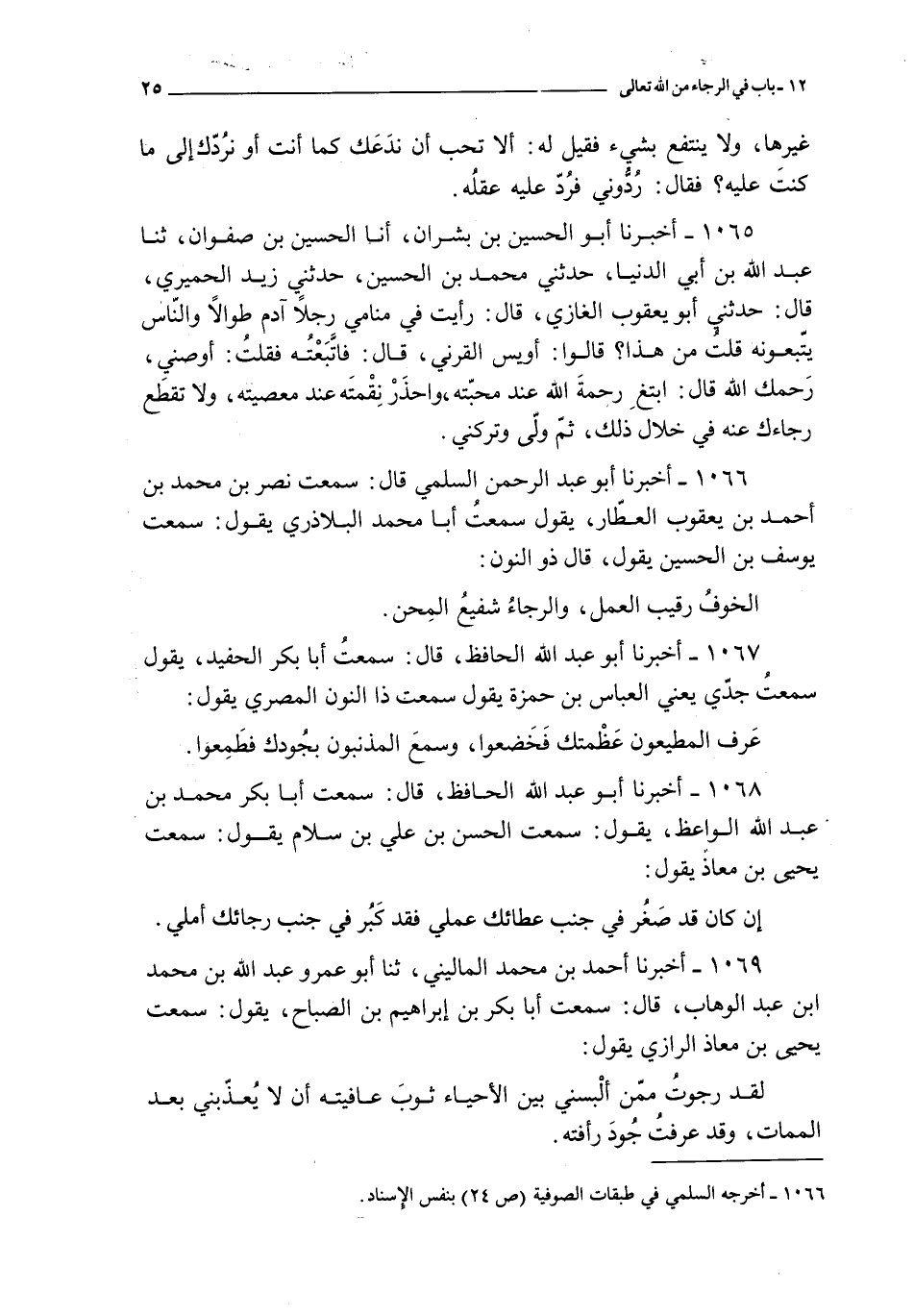 1066 - أخبرنا أبو عبد الرحمن السلمي قال : سمعت نصر بن أحمد بن يعقوب العطار يقول سمعت أبا محمد البلاذري يقول : سمعت يوسف بن الحسين يقول : قال ذو النون : الخوف رقيب العمل و الرجاء شفيع المحن