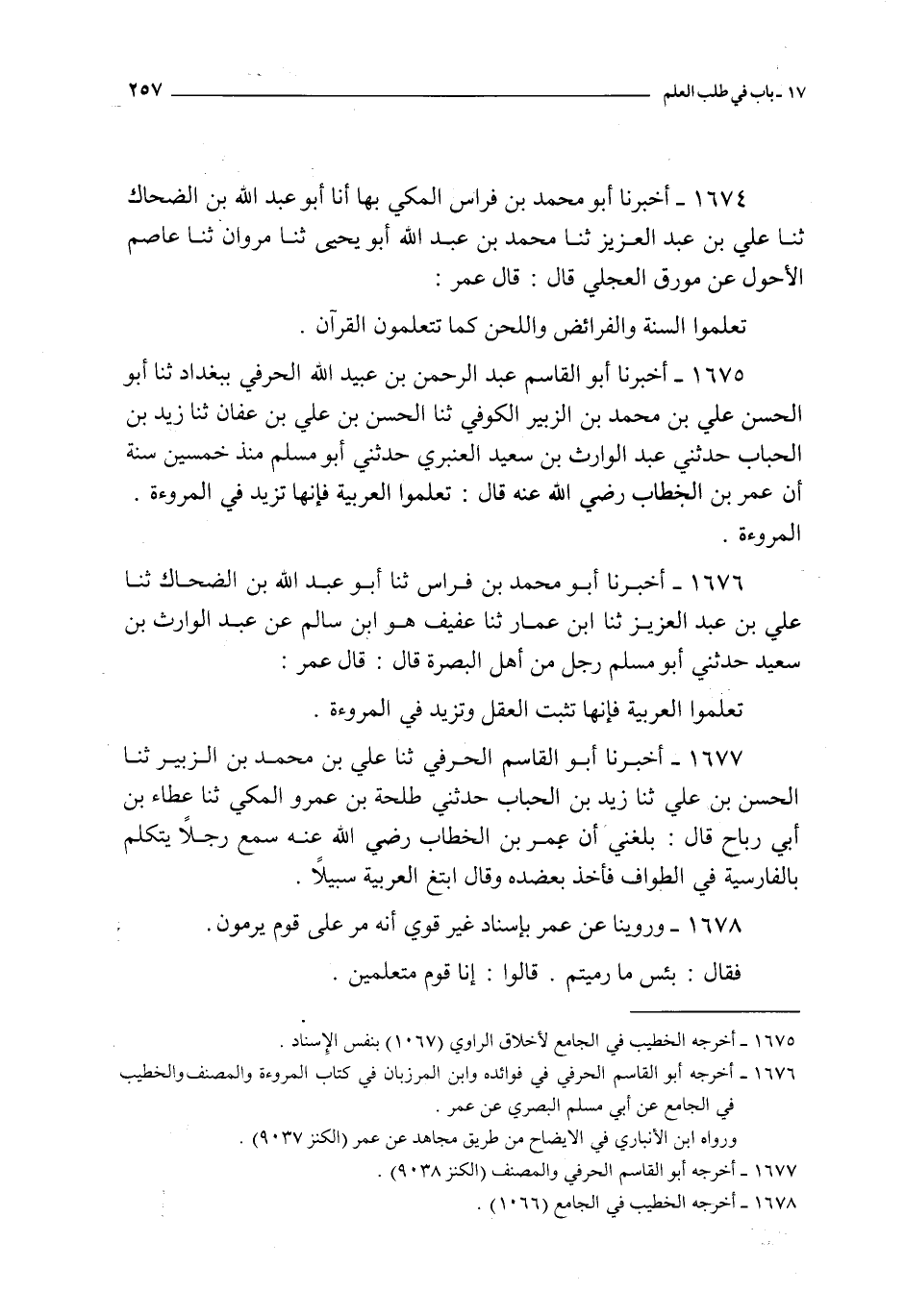 1675 - أخبرنا أبو القاسم عبد الرحمن بن عبيد الله الحرفي ببغداد ثنا أبو الحسن علي بن محمد بن الزبير الكوفي ثنا الحسن بن علي بن عفان ثنا زيد بن الحباب حدثني عبد الوارث بن سعيد العنبري حدثني أبو مسلم منذ خمسين سنة : أن عمر بن الخطاب رضي الله عنه قال : تعلموا العربية فإنها تزيد في المروءة