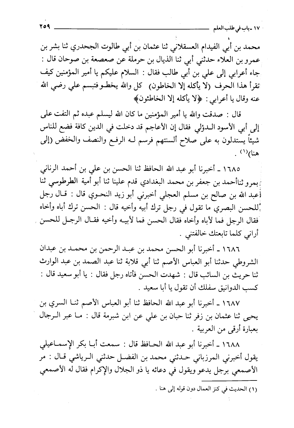 1688 - أخبرنا أبو عبد الله الحافظ قال : سمعت أبا بكر الإسماعيلي يقول أخبرني المرزباري حدثني محمد بن الفضل حدثني الرياشي قال : مر الأصمعي برجل يدعو و يقول في دعائه يا ذو الجلال و الإكرام فقال له الأصمعي هذا ما اسمك فقال الأصمعي : ( ) يناجي ربه باللحن كافاك إذا دعاه لا نحوت