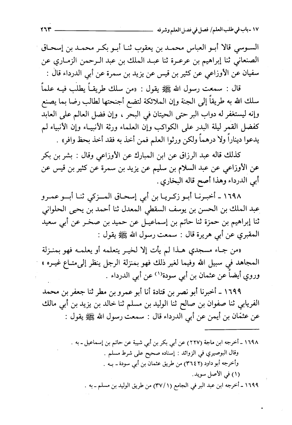 من جاء مسجدي هذا لم يأت إلا لخير يتعلمه أو يعلمه فهو بمنزلة المجاهد في سبيل الله و فيما لغير ذلك فهو بمنزلة الرجل ينظر إلى متاع غيره و روي أيضا عن عثمان بن أبي سودة عن أبي الدرداء