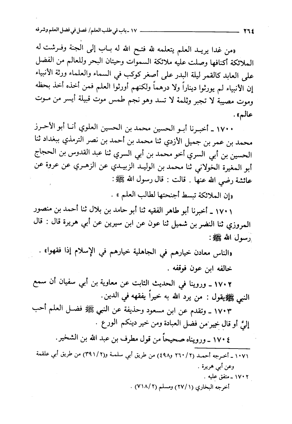 1701 - أخبرنا أبو طاهر الفقيه ثنا أبو حامد بن بلال ثنا أحمد بن منصور المروزي ثنا النضر بن شميل ثنا عون عن ابن سيرين عن أبي هريرة قال : قال رسول الله صلى الله عليه و سلم :