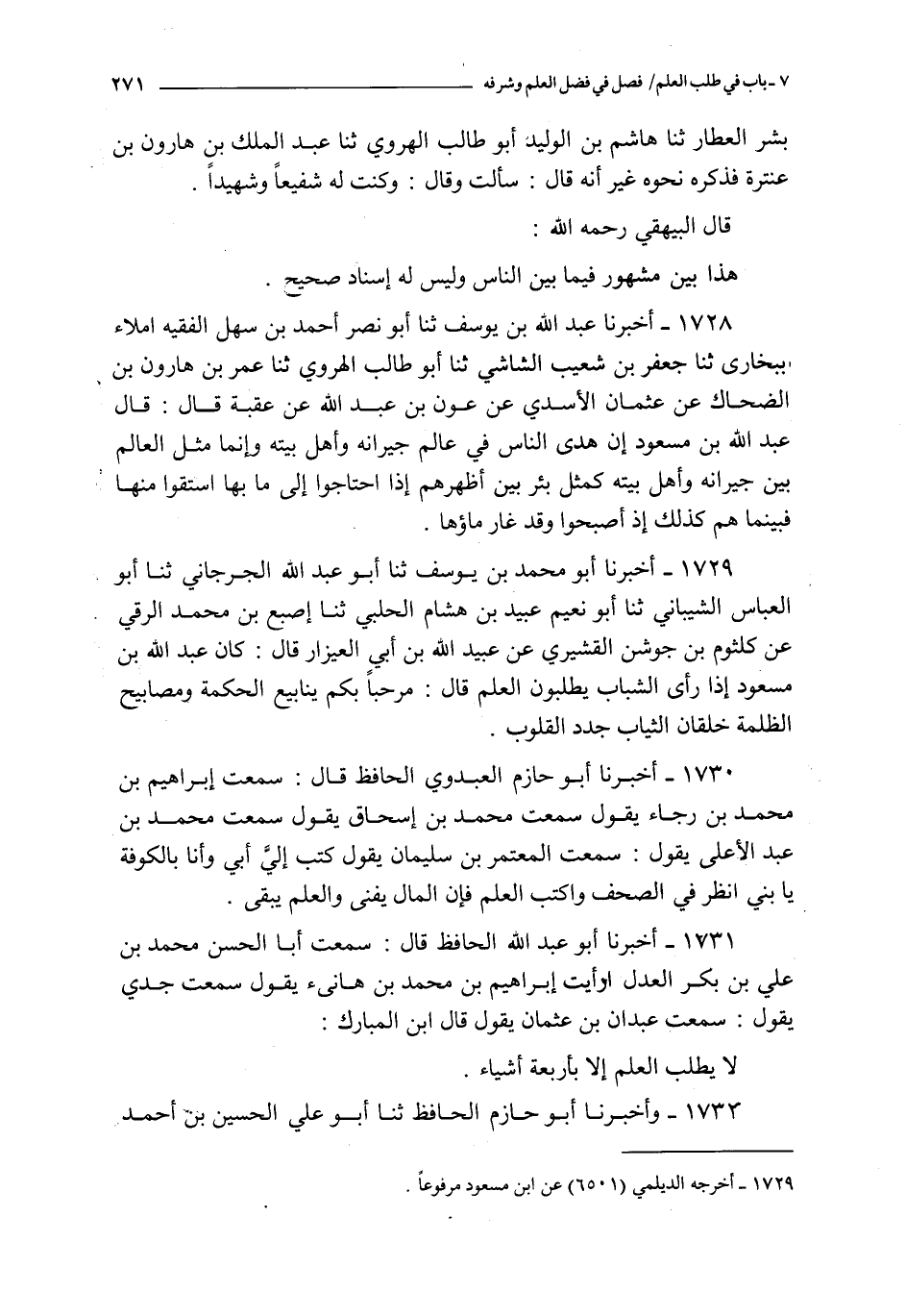 1732 - و أخبرنا أبو حازم الحافظ ثنا أبو علي الحسين بن أحمد الماسرجسي أنا أحمد بن محمد الحيري ثنا إبراهيم بن محمد بن هانئ ثنا أبي محمد بن هانئ قال : سمعت ابن المبارك يقول : لا يتم طلب العلم إلا بأربعة أشياء بالفراغ و المال و الحفظ و الورع