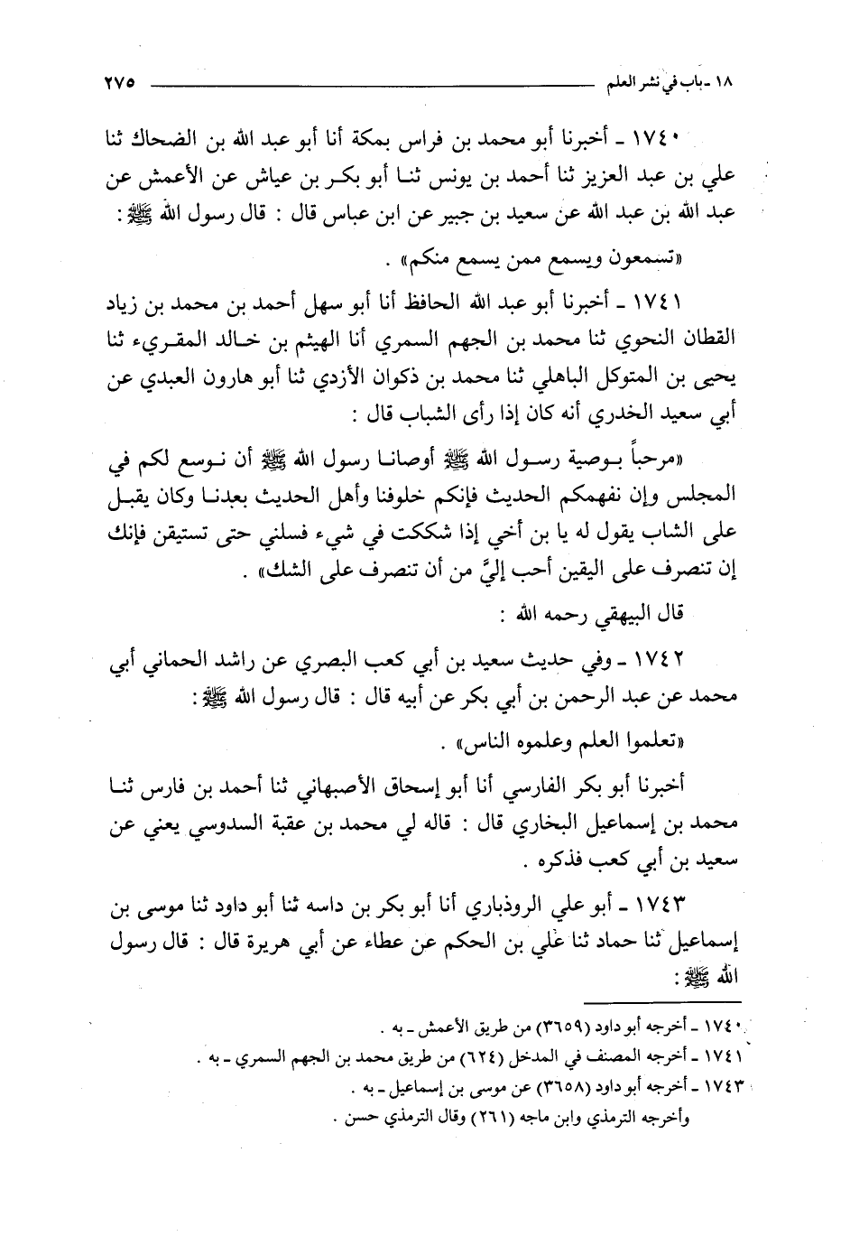 1741 - أخبرنا أبو عبد الله الحافظ أنا أبو سهل أحمد بن محمد بن زياد القطان النحوي ثنا محمد بن الجهم السمري أنا الهيثم بن خالد المقريء ثنا يحيى بن المتوكل الباهلي ثنا محمد بن ذكوان الأزدي ثنا أبو هارون العبدي عن أبي سعيد الخدري : أنه كان إذا رأى الشباب قال : مرحبا بوصية رسول الله صلى الله عليه و سلم أوصانا رسول الله صلى الله عليه و سلم أن نوسع لكم في المجلس و أن نفهمكم الحديث فإنكم خلوفنا و أهل الحديث بعدنا و كان يقبل على الشاب يقول له يا بن أخي إذا شككت في شيء فسلني حتى تستيقن فإنك إن تنصرف على اليقين أحب إلي من أن تنصرف على الشك