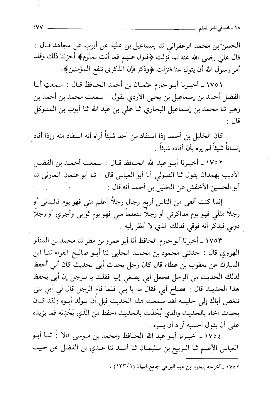 1751 - أخبرنا أبو حازم عثمان بن أحمد الحافظ قال : سمعت أبا الفضل أحمد بن إسماعيل بن يحيى الأزدي يقول : سمعت محمد بن أحمد بن زهير ثنا محمد بن إسماعيل البخاري ثنا علي بن عبد الله ثنا أيوب بن المتوكل قال : كان الخليل بن أحمد إذا استفاد من أحد شيئا أراه أن استفاد منه و إذا أفاد إنسانا شيئا لم يره بأن أفاده شيئا