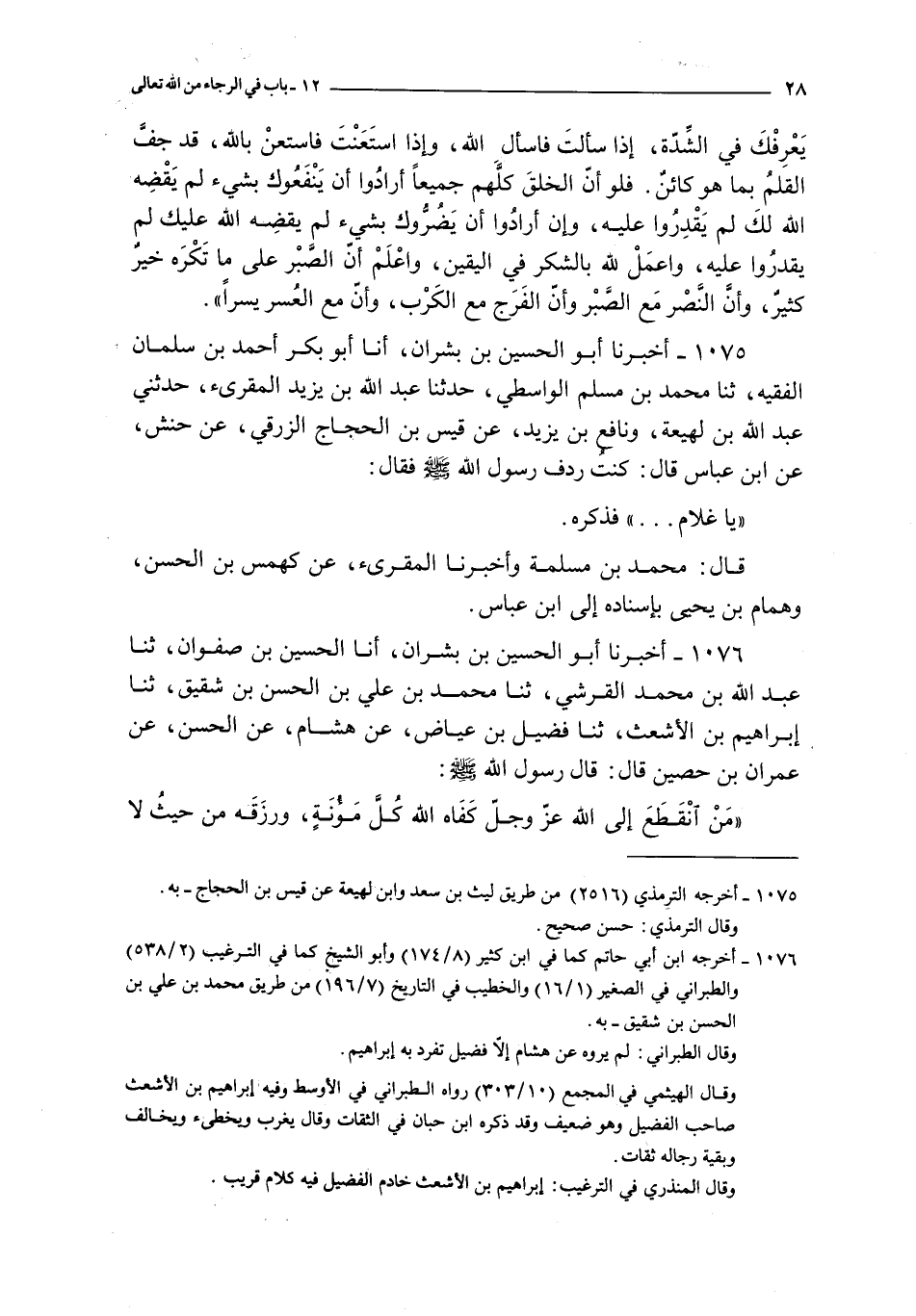1076 - أخبرنا أبو حسين بن بشران أنا الحسين بن صفوان ثنا عبد الله بن محمد القرشي ثنا محمد بن علي بن الحسن بن شقيق ثنا إبراهيم بن الأشعث ثنا فضل بن عياض عن هشام عن الحسن عن عمران بن حصين قال : قال رسول الله صلى الله عليه و سلم :