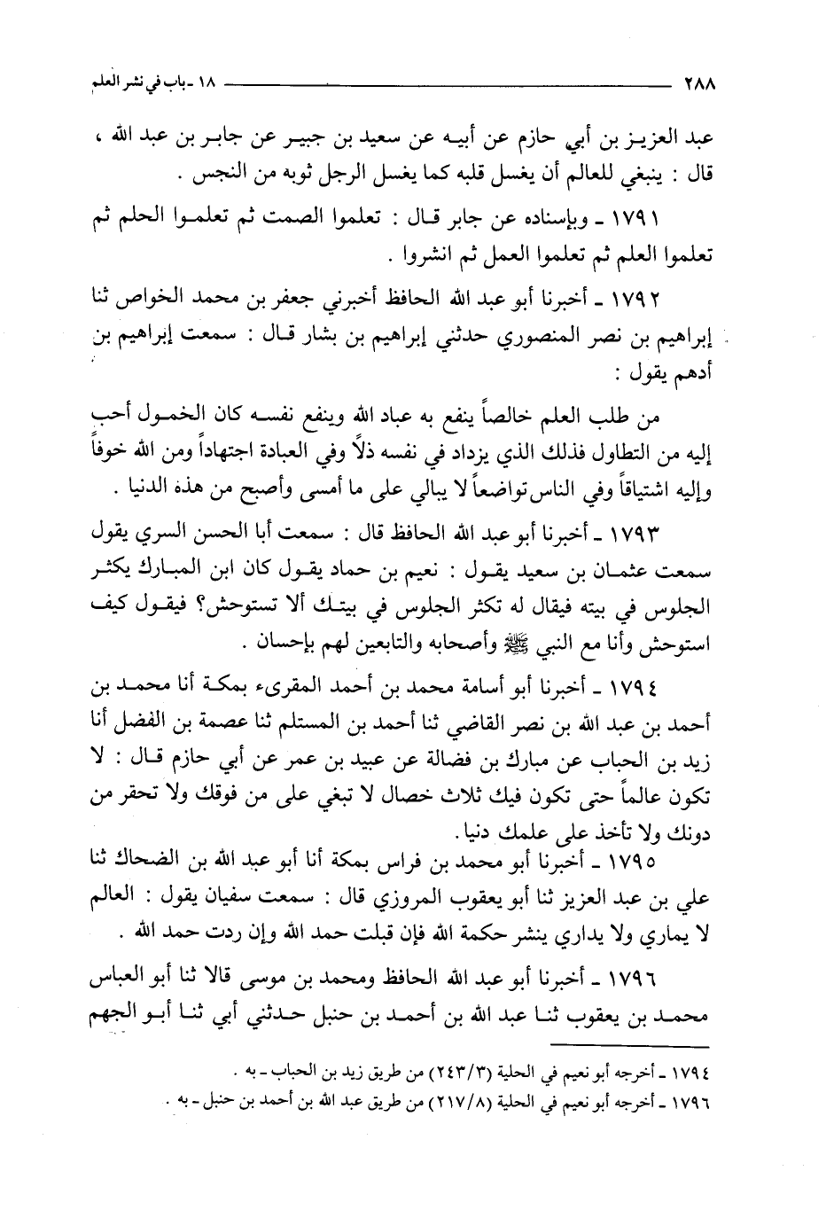 1796 - أخبرنا أبو عبد الله الحافظ و محمد بن موسى قالا ثنا أبو العباس محمد بن يعقوب ثنا عبد الله بن أحمد بن حنبل حدثني أبي ثنا أبو الجهم عبد القدوس بن برك بن خنيس عن محمد بن النضر الحارثي قال : كان يقال أول التعليم الإنصات له ثم الاستماع له ثم حفظه ثم العمل ثم النشر