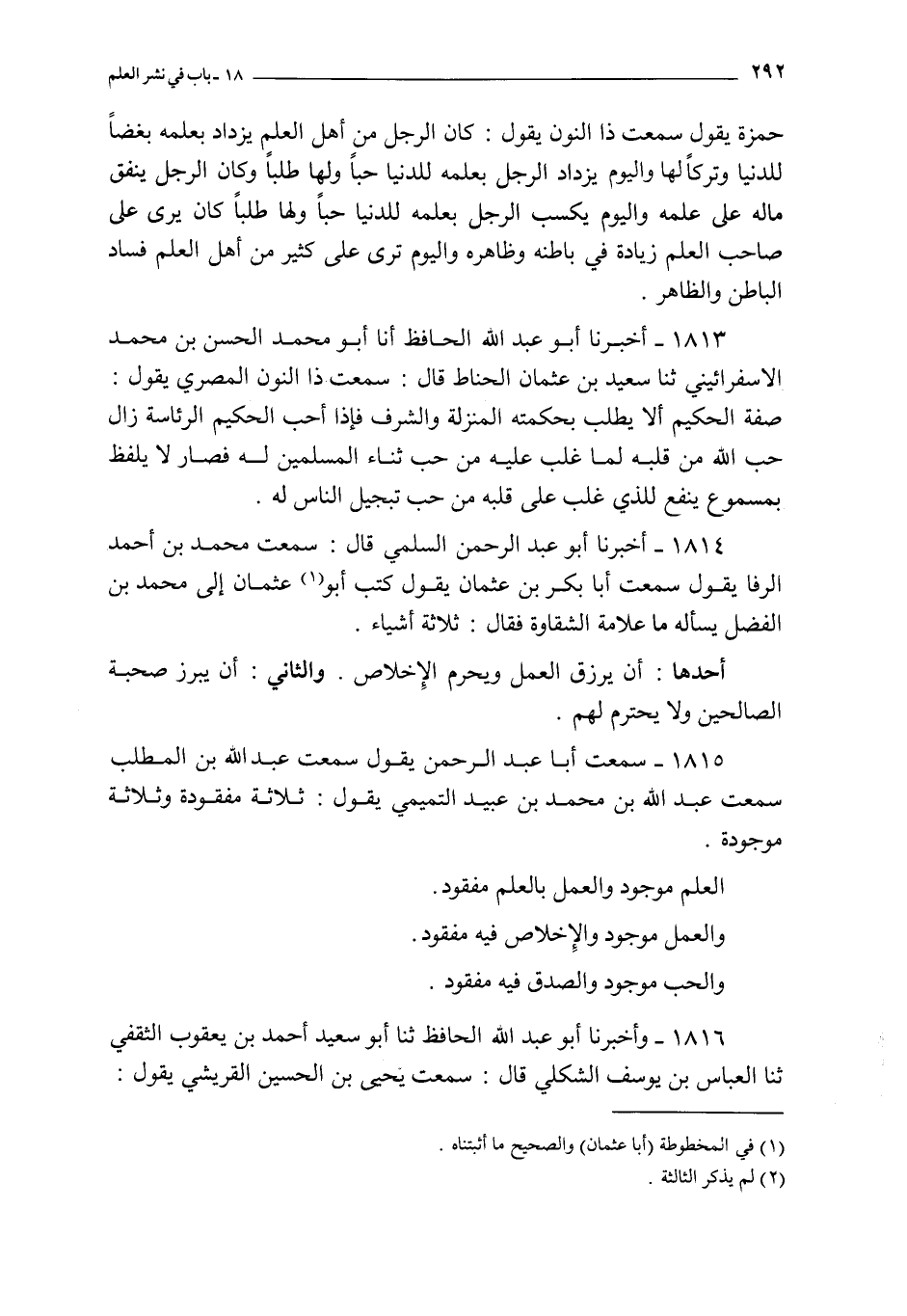 1815 - سمعت أبا عبد الرحمن يقول سمعت عبد الله بن المطلب سمعت عبد الله بن محمد بن عبيد التميمي يقول : ثلاثة مفقودة و ثلاثة موجودة