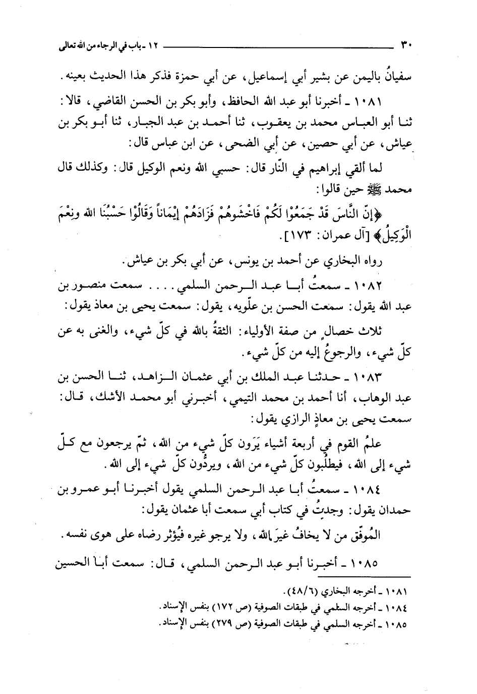 1082 - سمعت أبا عبد الرحمن السلمي سمعت منصور بن عبد الله يقول : سمعت الحسن بن علويه يقول : سمعت يحيى بن معاذ يقول : ثلاث خصال من صفة الأولياء الثقة بالله في كل شيء و الغنى به عن كل شي و الرجوع إليه من كل شيء