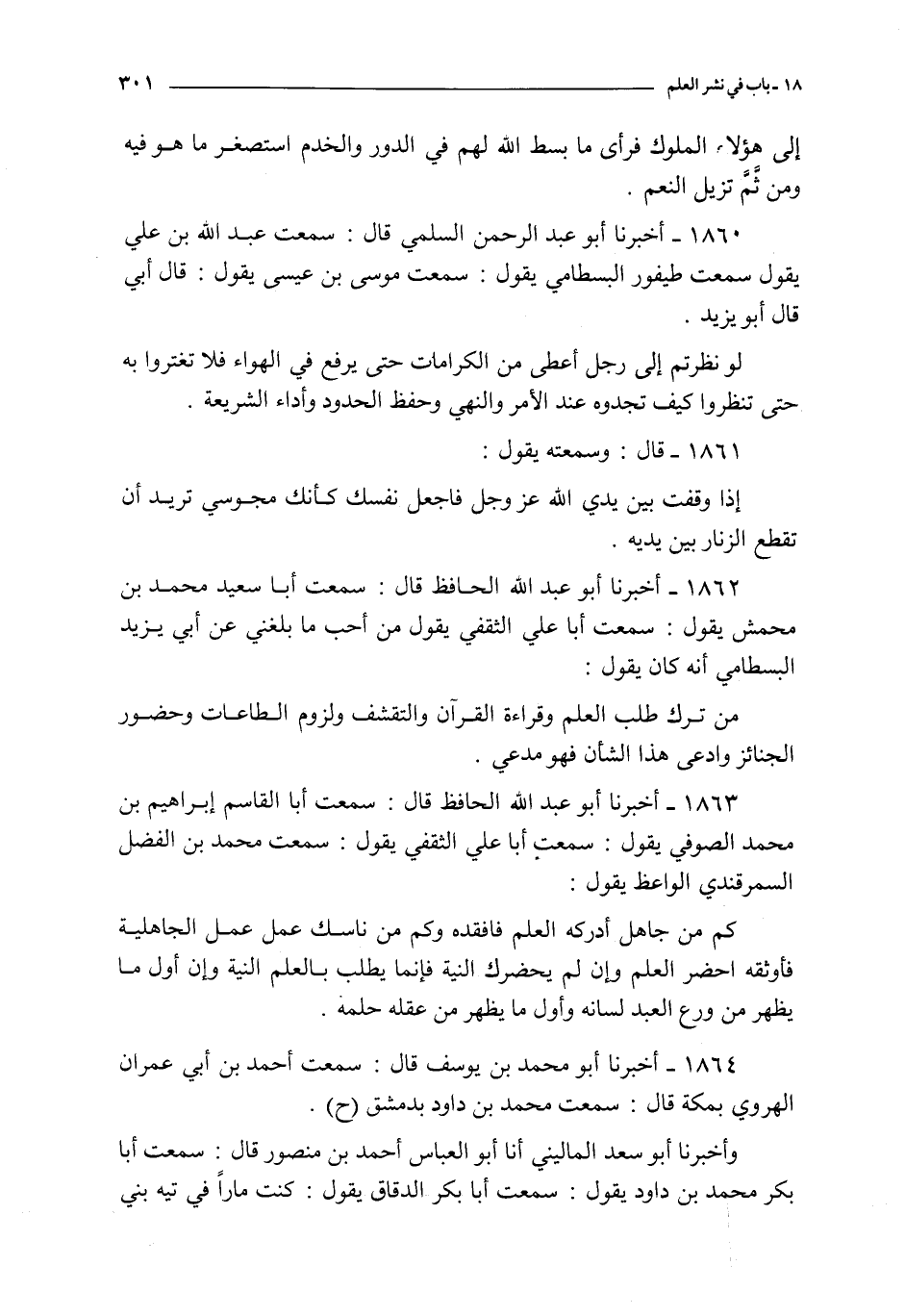 1862 - أخبرنا أبو عبد الله الحافظ قال : سمعت أبا سعيد محمد بن محمش يقول : سمعت أبا علي الثقفي يقول من أحب ما بلغني عن أبي يزيد البسطامي أنه كان يقول : من ترك طلب العلم و قراءة القرآن و التقشف و لزوم الطاعات و حضور الجنائز و ادعى هذا الشأن فهو مدعي