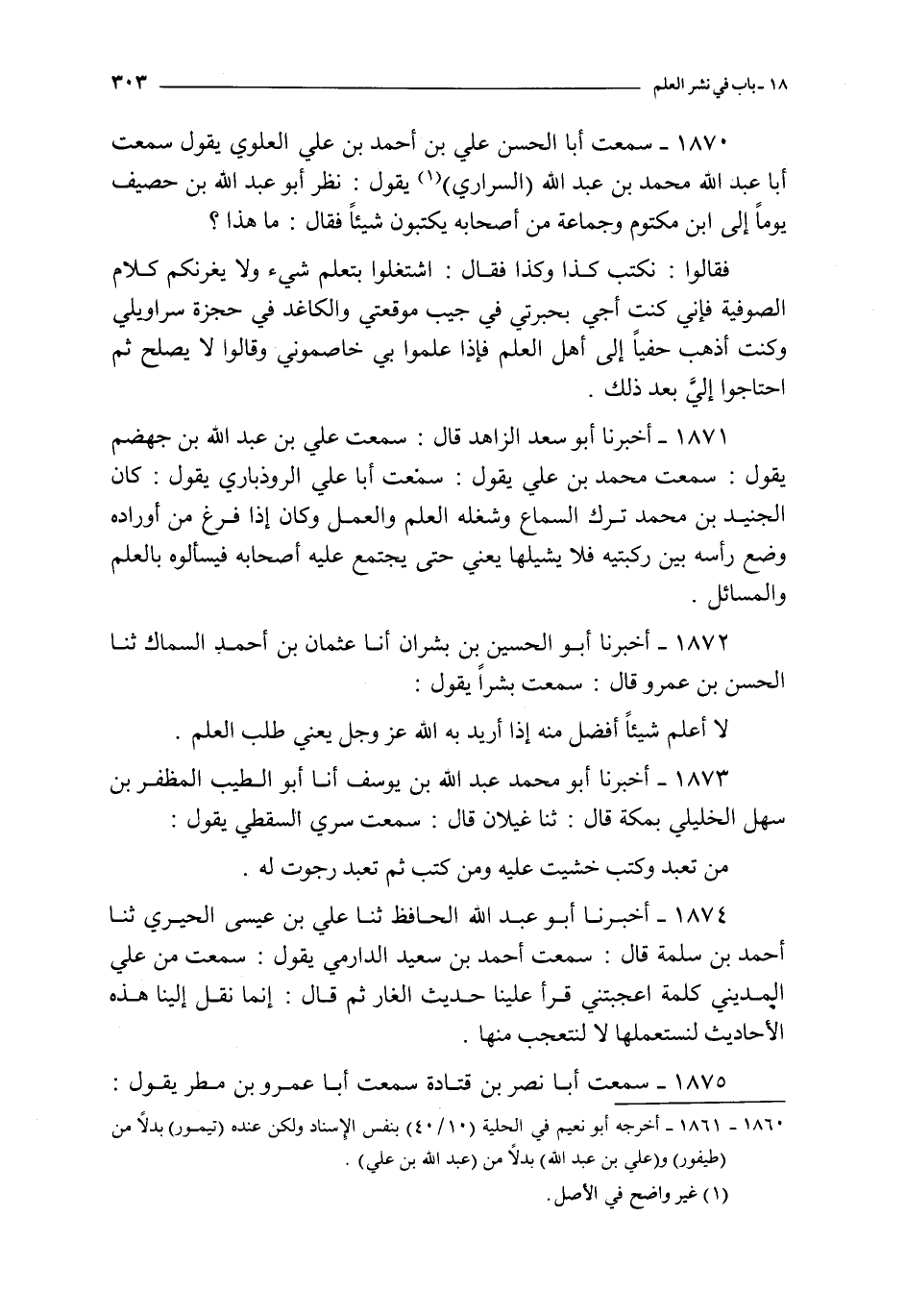 1873 - أخبرنا أبو محمد عبد الله بن يوسف أنا أبو الطيب المظفر بن سهل الخليلي بمكة قال : ثنا غيلان قال : سمعت سري السقطي يقول : من تعبد و كتب خشيت عليه و من كتب ثم تعبد رجوت له