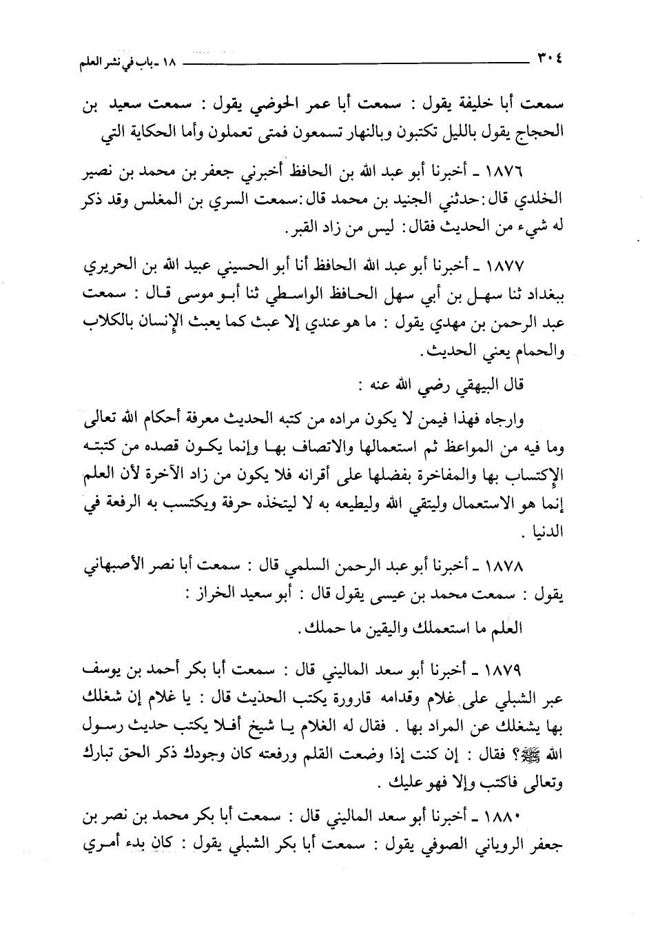 1879 - أخبرنا أبو سعد الماليني قال : سمعت أبا بكر أحمد بن يوسف : عبر الشبلي على غلام و قدامه قارورة يكتب الحديث قال : يا غلام إن شغلك بها يشغلك عن المراد بها فقال له الغلام يا شيخ أفلا يكتب حديث رسول الله صلى الله عليه و سلم ؟ فقال : إن كنت إذا وضعت القلم و رفعته كان وجدك ذكر الحق تبارك و تعالى فاكتب و إلا فهو عليك