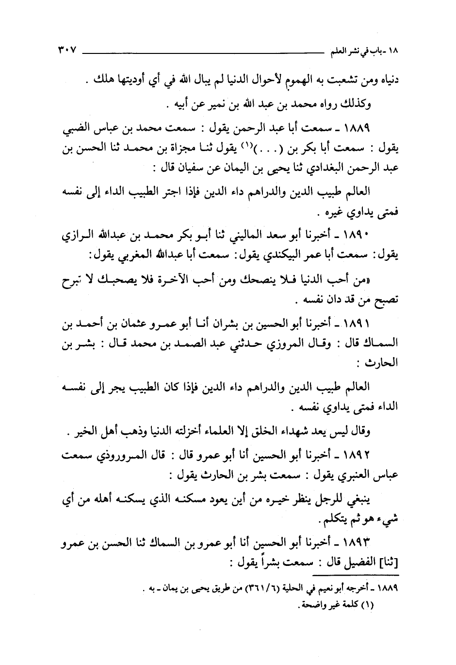 1891 - أخبرنا أبو حسين بن بشران أنا أبو عمرو عثمان بن أحمد بن السماك قال : و قال المروزي حدثني عبد الصمد بن محمد قال : بشر بن الحارث : العالم طبيب الدين و الدراهم داء الدين فإذا كان الطبيب يجر إلى نفسه الداء فمتى يداوي نفسه