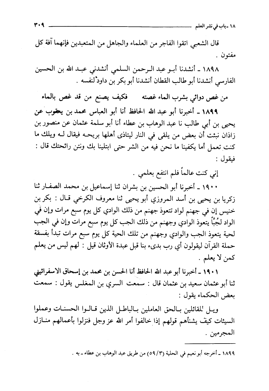 1900 - أخبرنا أبو الحسين بن بشران ثنا إسماعيل بن محمد الصفار ثنا زكريا بن يحيى بن أسد المروزي أبو يحيى ثنا معروف الكرخي قال بكر بن خنيس : إن في جهنم لواد تتعوذ جهنم من ذلك الوادي كل يوم سبع مرات و إن في الواد لجبا يتعوذ الوادي و جهنم من ذلك الجب كل يوم سبع مرات و إن في الجب لحية يتعوذ الجب و الوادي و جهنم من تلك الحية كل يوم سبع مرات تبدأ بفسقة حملة القرآن ليقولون أي رب بدئ بنا قبل عبدة الأوثان قيل : لهم ليس من يعلم كمن لا يعلم