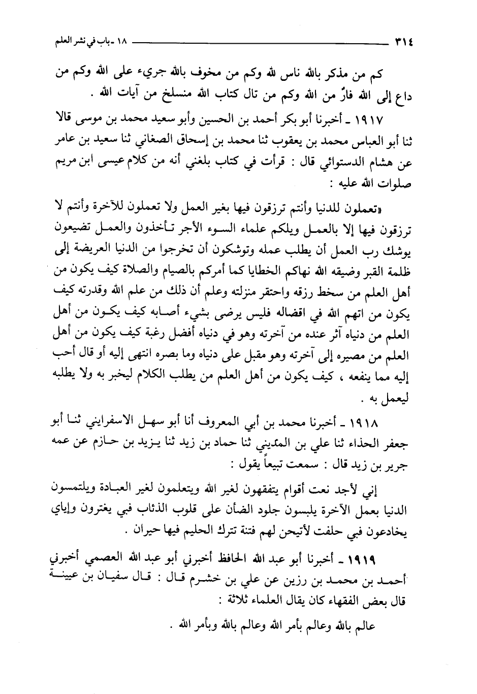 1919 - أخبرنا أبو عبد الله الحافظ أخبرني أبو عبد الله العصمي أخبرني أحمد بن محمد بن رزين عن علي بن خشرم قال : قال سفيان بن عيينة قال بعض الفقهاء : كان يقال العلماء ثلاثة :