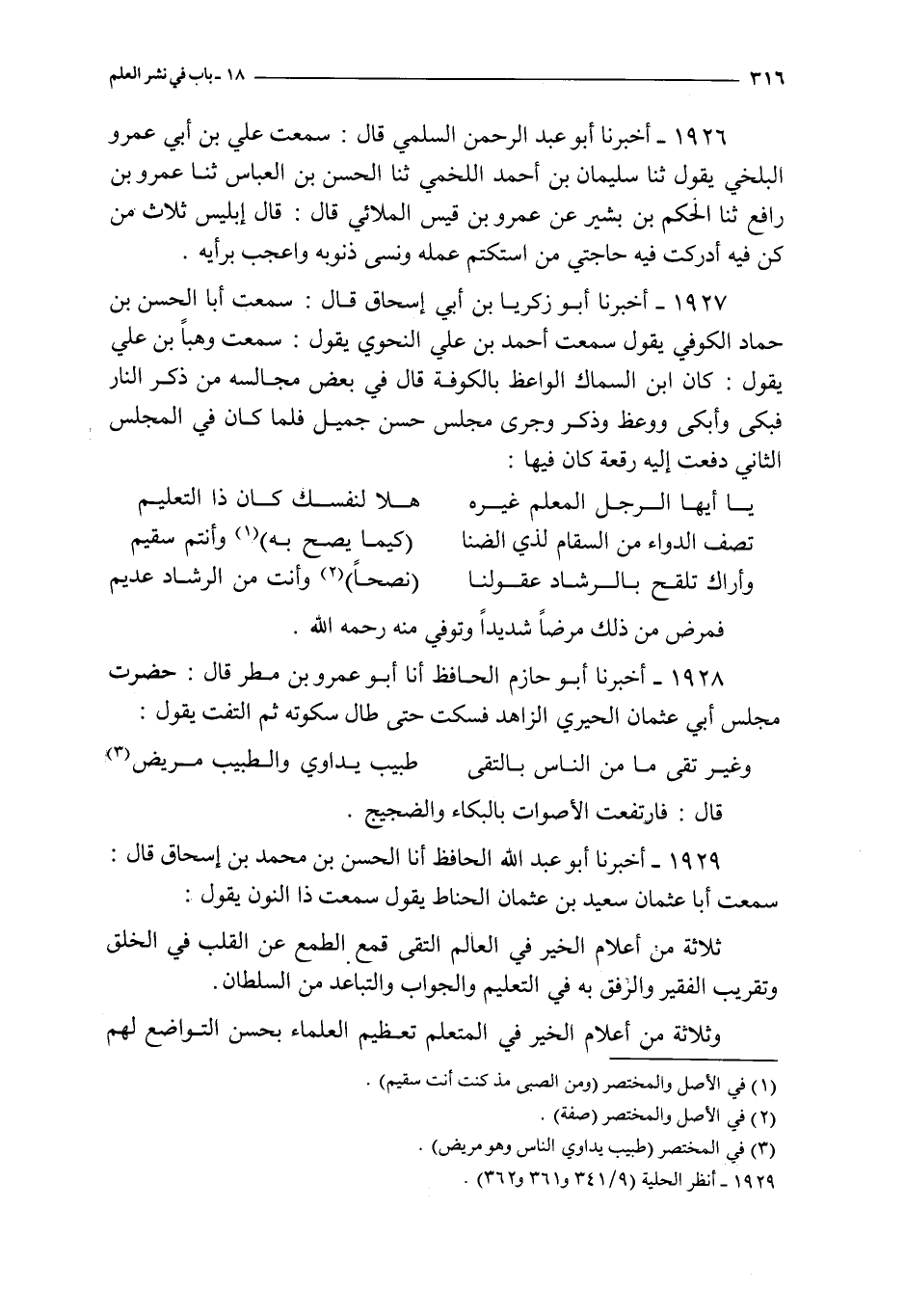 1928 - أخبرنا أبو حازم الحافظ أنا أبو عمرو بن مطر قال : حضرت مجلس أبي عثمان الحيري الزاهد فسكت حتى طال سكوته ثم التفت يقول :