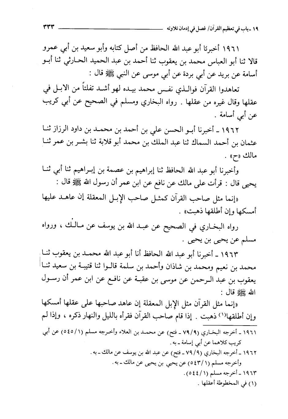 1963 - أخبرنا أبو عبد الله الحافظ أنا أبو عبد الله محمد بن يعقوب ثنا محمد بن نعيم و محمد بن شاذان و أحمد بن سلمة قالوا ثنا قتيبة بن سعيد ثنا يعقوب بن عبد الرحمن عن موسى بن عقبة عن نافع عن ابن عمر : أن رسول الله صلى الله عليه و سلم قال : إنما مثل القرآن مثل الإبل المعقلة إن عاهد صاحبها على عقلها أمسكها و إن أطلقها ذهبت إذا قام صاحب القرآن فقرأه بالليل و النهار ذكره و إذا لم يقرأ نسيه رواه مسلم عن قتيبة