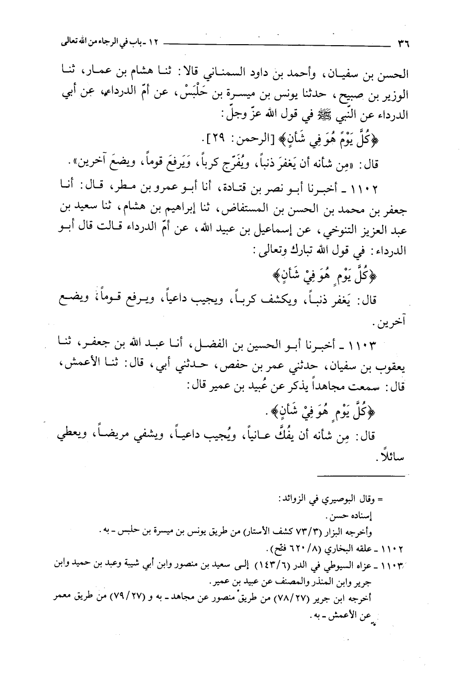 1102 - أخبرنا أبو نصر بن قتادة أنا أبو عمرو بن مطر قال : أنا جعفر بن محمد بن الحسن بن المستفاض ثنا إبراهيم بن هشام ثنا سعيد بن عبد العزيز التنوخي عن إسماعيل بن عبيد الله عن أم الدرداء قالت قال أبو الدرداء : في قول الله تبارك و تعالى : { كل يوم هو في شأن }
