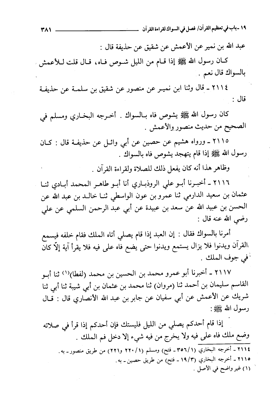 2114 - قال و ثنا ابن نمير عن منصور عن شقيق بن سلمة عن حذيفة قال : كان رسول الله صلى الله عليه و سلم صلى الله عليه و سلم يشوص فاه بالسواك أخرجه البخاري و مسلم في الصحيح من حديث منصور و الأعمش