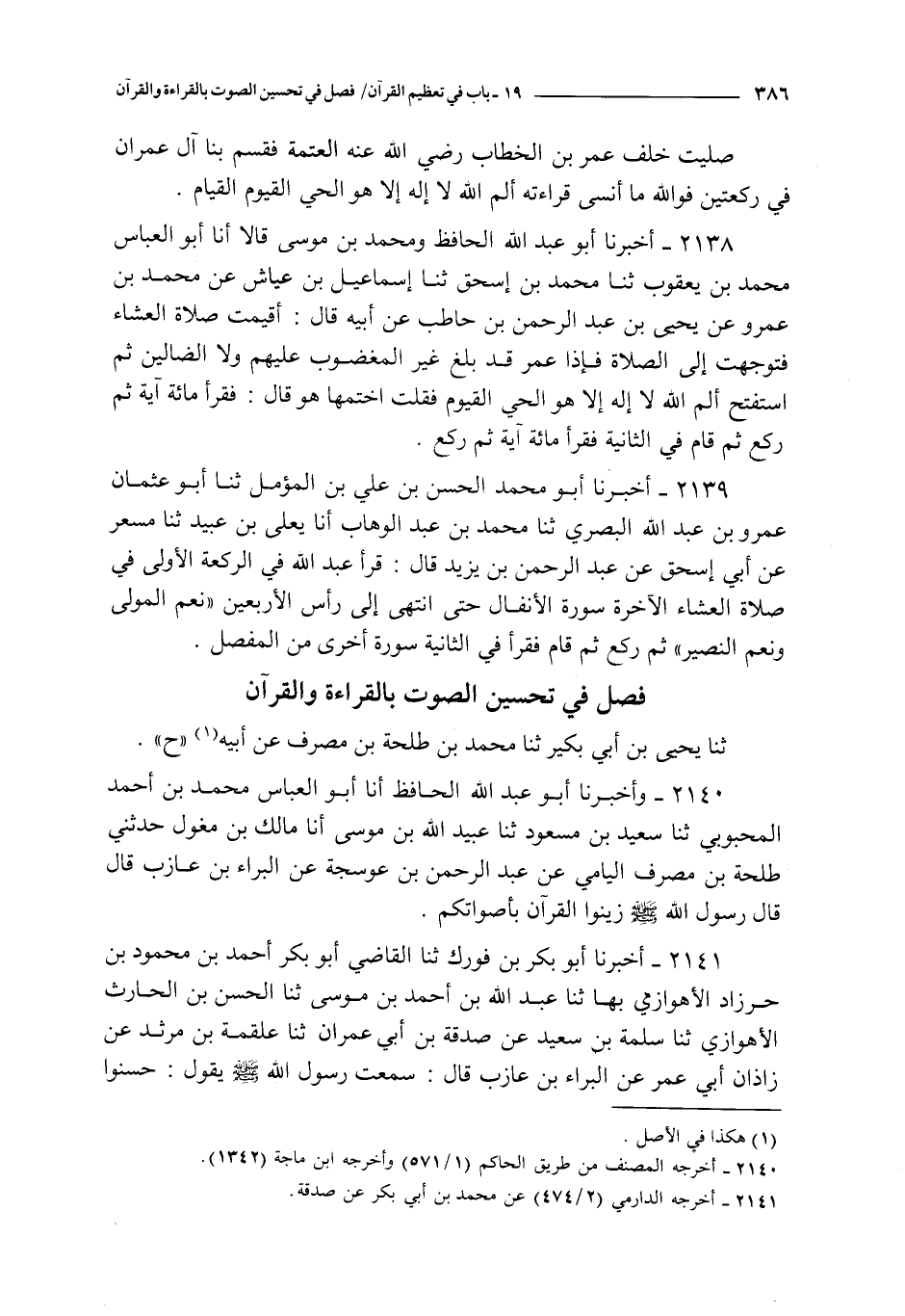2140 - و أخبرنا أبو عبد الله الحافظ أنا أبو العباس محمد بن أحمد المحبوبي ثنا سعيد بن مسعود ثنا عبيد الله بن موسى أنا مالك بن مغول حدثني طلحة بن مصرف اليامي عن عبد الرحمن بن عوسجة عن البراء بن عازب قال : قال رسول الله صلى الله عليه و سلم زينوا القرآن بأصواتكم