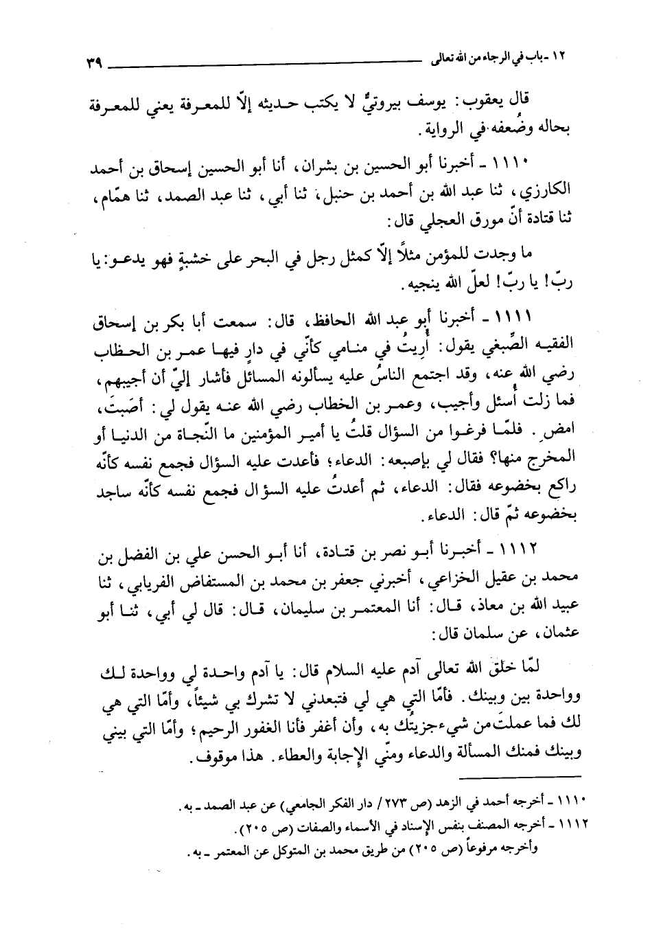 1110 - أخبرنا أبو حسين بن بشران أنا أبو الحسين إسحاق بن أحمد الكارزي ثنا عبد الله بن أحمد بن حنبل ثنا أبي ثنا عبد الصمد ثنا همام ثنا قتادة أن مورق العجلي قال : ما وجدت للمؤمن مثلا إلا كمثل رجل في البحر على خشبة فهو يدعو : يا رب ! يا رب ! لعل الله ينجيه