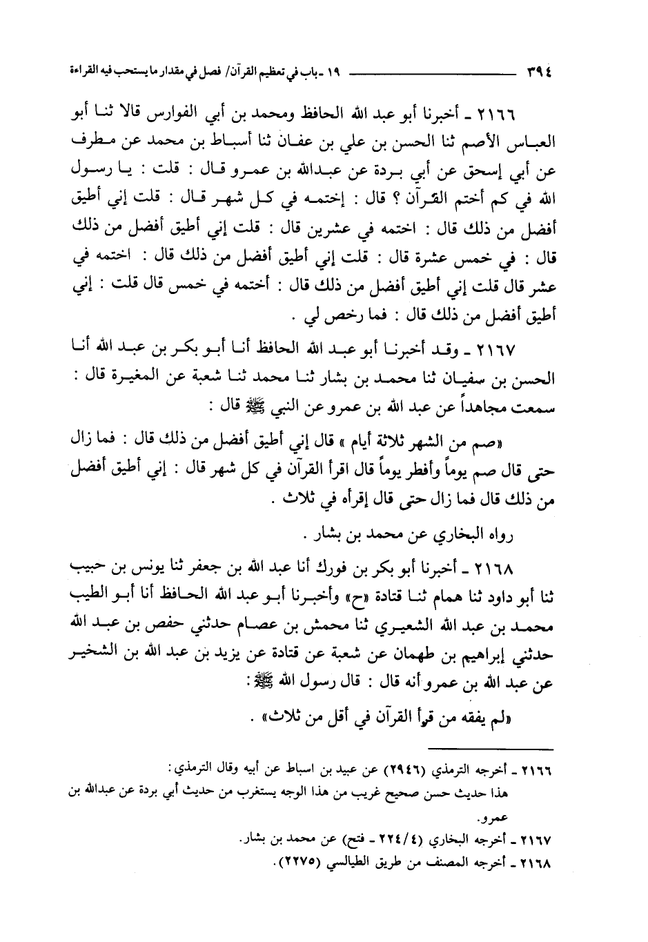 2166 - أخبرنا أبو عبد الله الحافظ و محمد بن أبي الفوارس قالا ثنا أبو العباس الأصم ثنا الحسن بن علي بن عفان ثنا أسباط بن محمد عن مطرف عن أبي إسحق عن أبي بردة عن عبد الله بن عمرو قال : قلت : يا رسول الله في كم أختم القرآن ؟ قال : اختمه في كل شهر قال : قلت إني أطيق أفضل من ذلك قال : اختمه في عشرين قال : قلت إني أطيق أفضل من ذلك قال : في خمس عشرة قال : قلت إني أطيق أفضل من ذلك قال : اختمه في عشر قال : قلت إني أطيق أفضل من ذلك قال : اختمه في خمس قال : قلت إني أطيق أفضل من ذلك قال : فما رخص لي